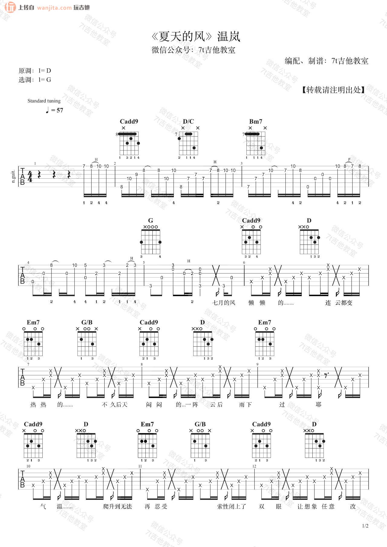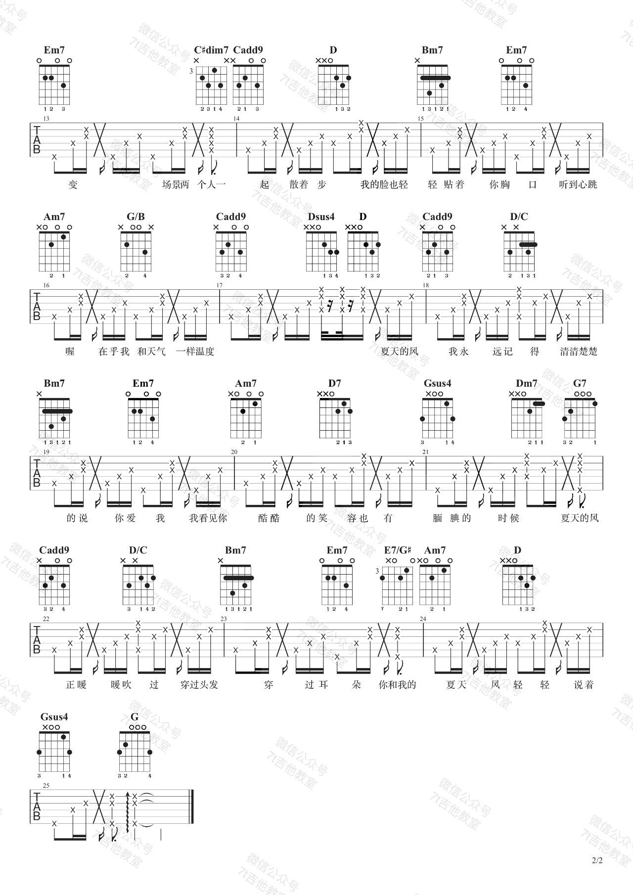 曲谱介绍: 温岚《夏天的风》吉他弹唱谱,采用D调指法编配,共有2张高清图谱,免翻页排版设计。