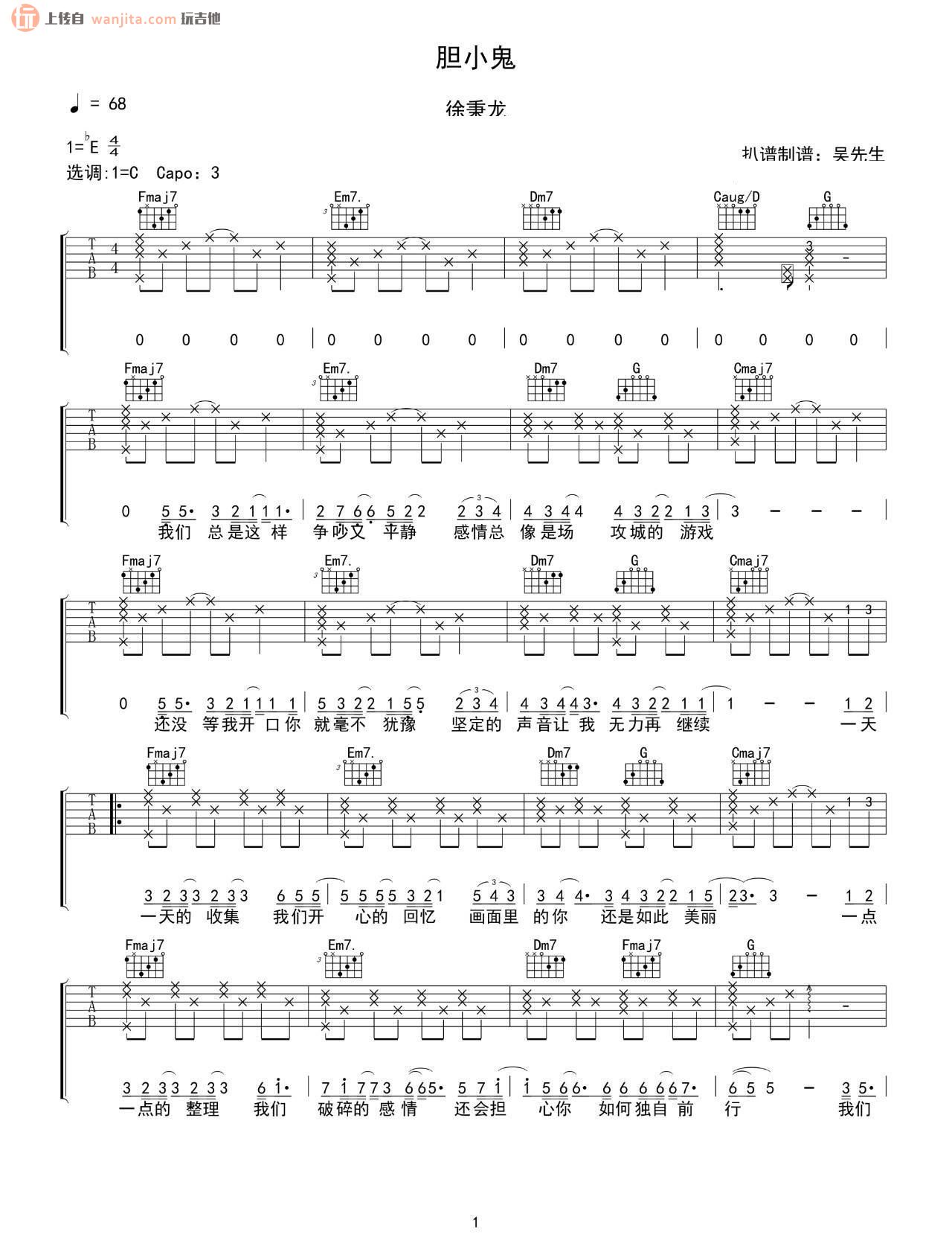 曲谱介绍: 《胆小鬼》吉他谱是由吴先生编配的版本,选用C调,原调是bE调,我们可以夹在第三品进行弹唱,C调的编配还是比较简单,所以也容易上手。胆小鬼这首歌讲述着爱情两端的攻防角色关系,当我们差那一步的时候,可能这也是最遥远的距离。