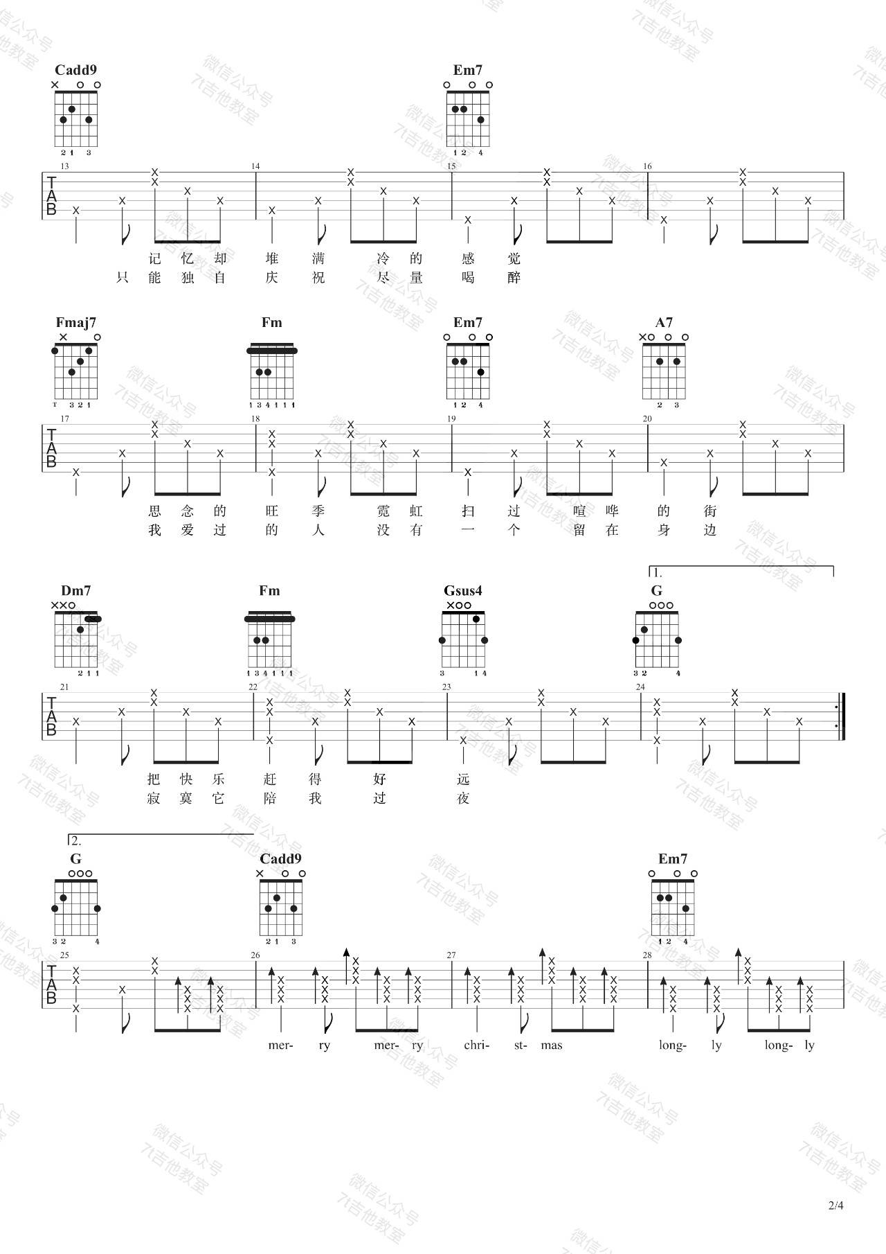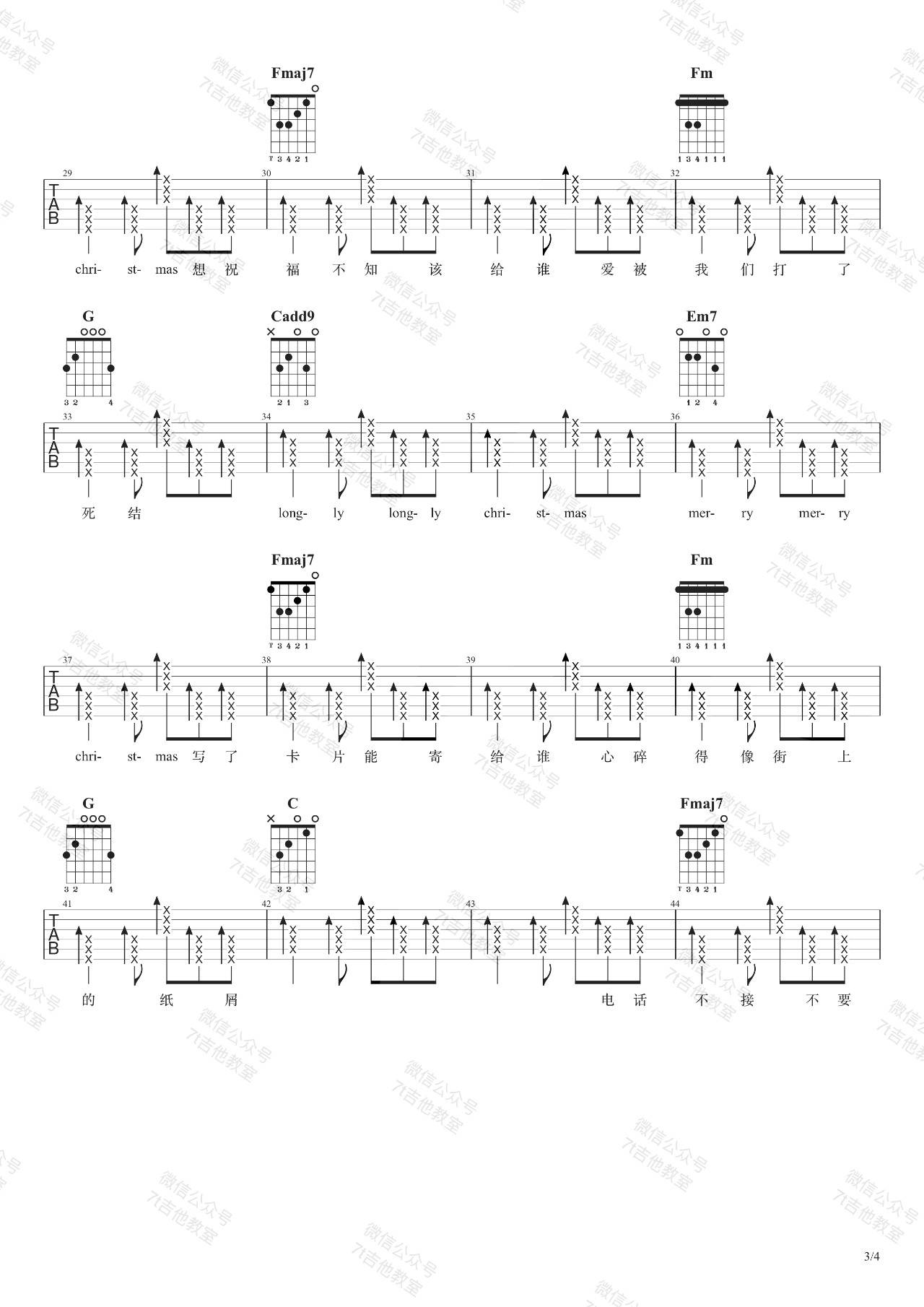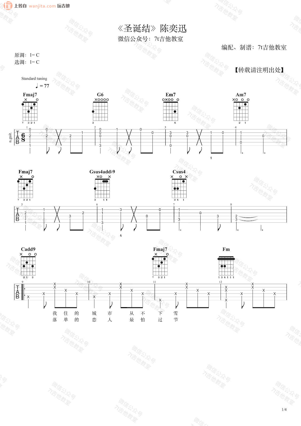 曲谱介绍: 圣诞结吉他谱_C调六线谱陈奕迅演唱,这个版本包含7T吉他提供的吉他弹唱视频演示,总共4张高清图片谱。原调选用C调指法,但视频里是降半音调弦。女生可以根据自己的音调使用变调夹,建议夹在第三品弹唱。这是一个比较不错的编配版本,十分接近原版,这是一首非常浪漫的节日情歌,也许一个圣诞节,也是一个圣诞结,在孤单的角落一个人,一首歌,弹的是一种情绪。