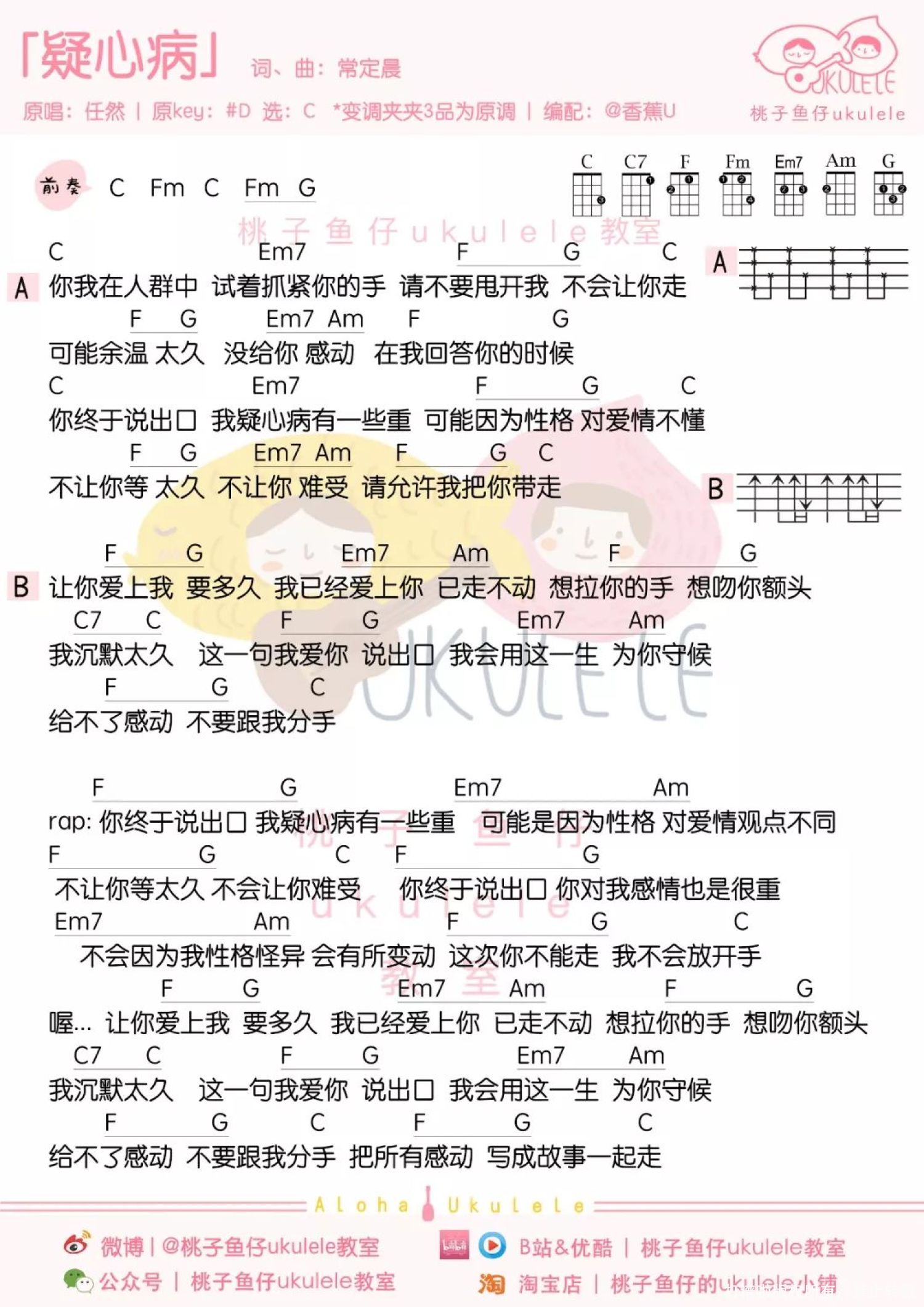 曲谱介绍: 关于歌曲 《疑心病》是由常定晨作词作曲,并由任然演唱的一首歌,发行于2015年9月27日,收录于专辑《从小到大》。   疑心病尤克里里谱