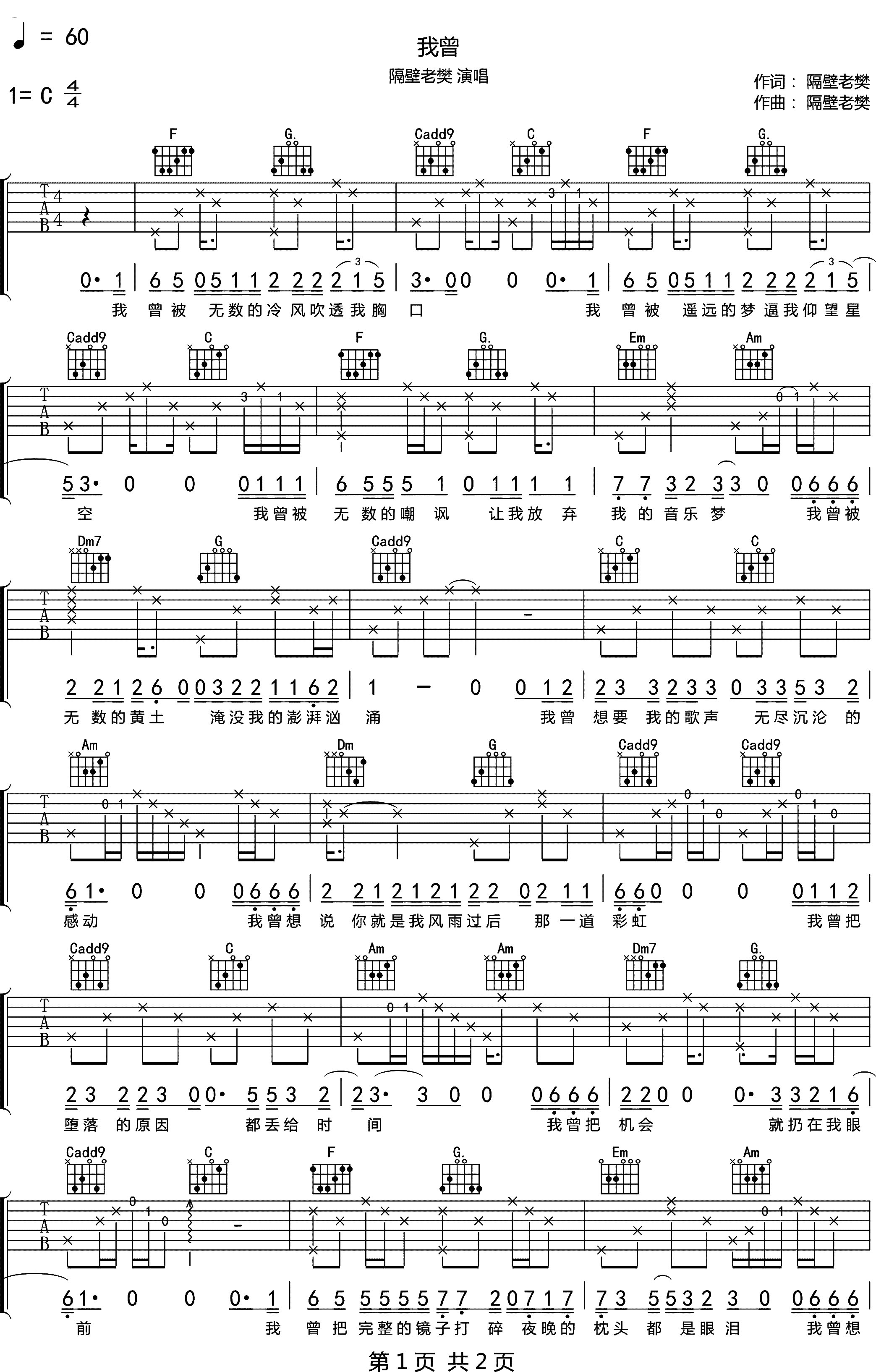 我曾吉他谱 - 隔壁老樊 - C调吉他弹唱谱