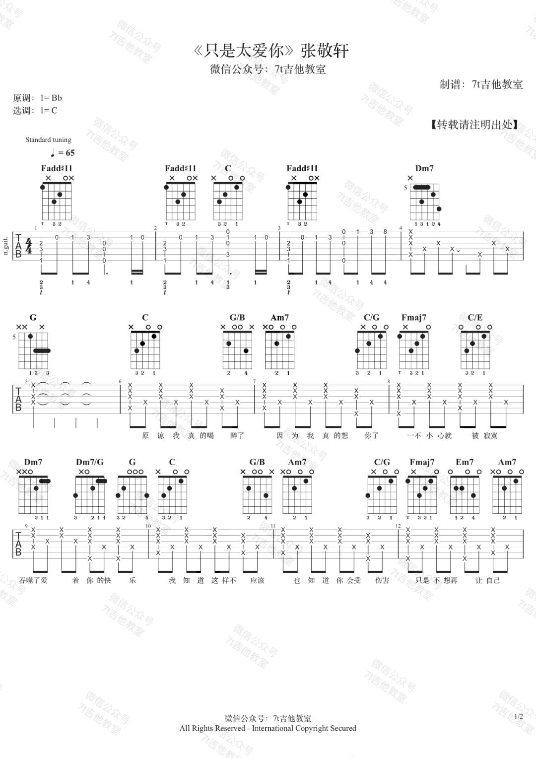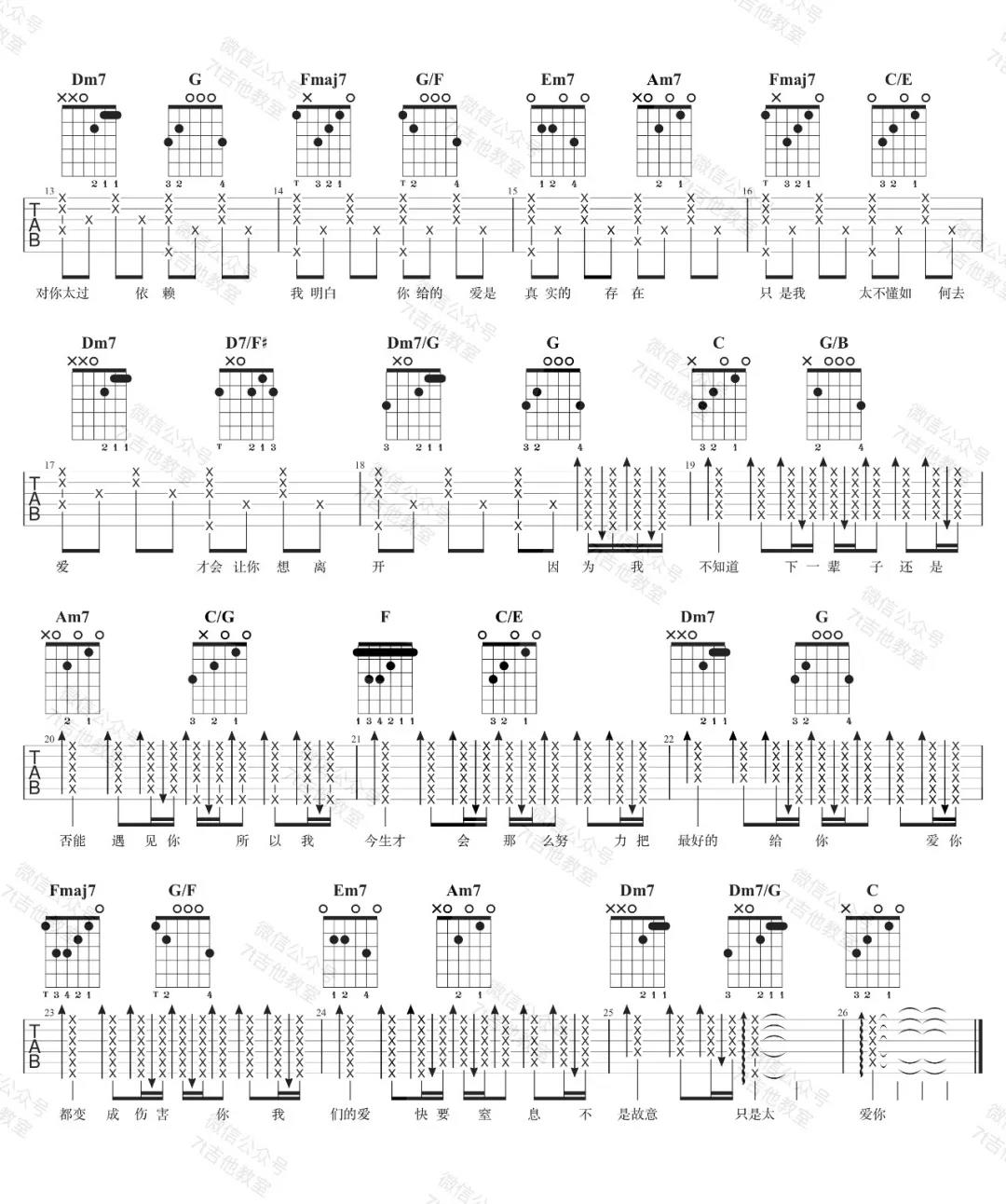 曲谱介绍: 《只是太爱你》吉他谱的原调是Bb大调,视频里我用了C大调的指法来编配(视频里是标准音调弦,变调夹夹在第4品,实际弹出来是E大调,比较适合音域较低的男生以及音域较高的女生)