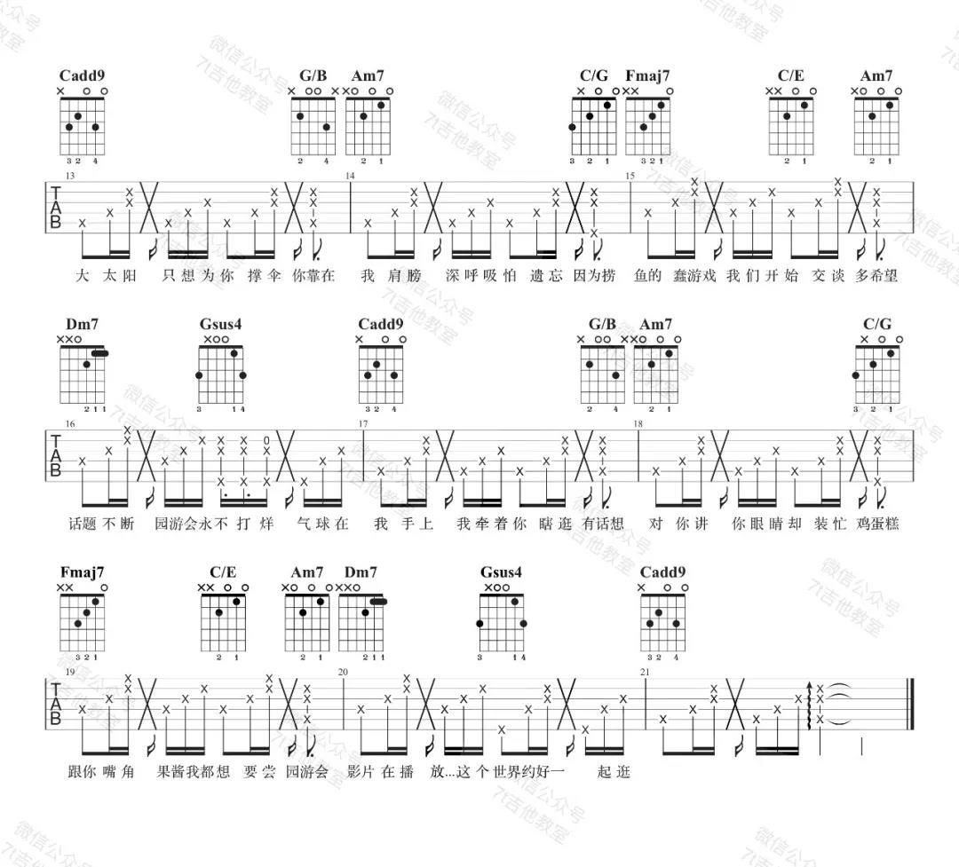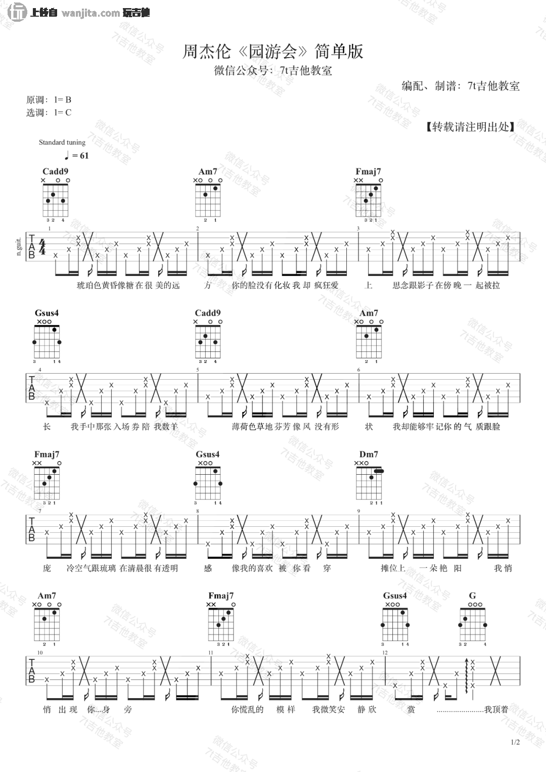 曲谱介绍: 《园游会》这首歌的原调是B大调,考虑到女孩子弹唱难易程度,所以这个简单版谱子用的是C大调的指法来编配,视频里是标准音调弦,变调夹夹在第2品,适合音域较高的女生演唱。如果觉得太高也可以少夹一点或者不夹哦!