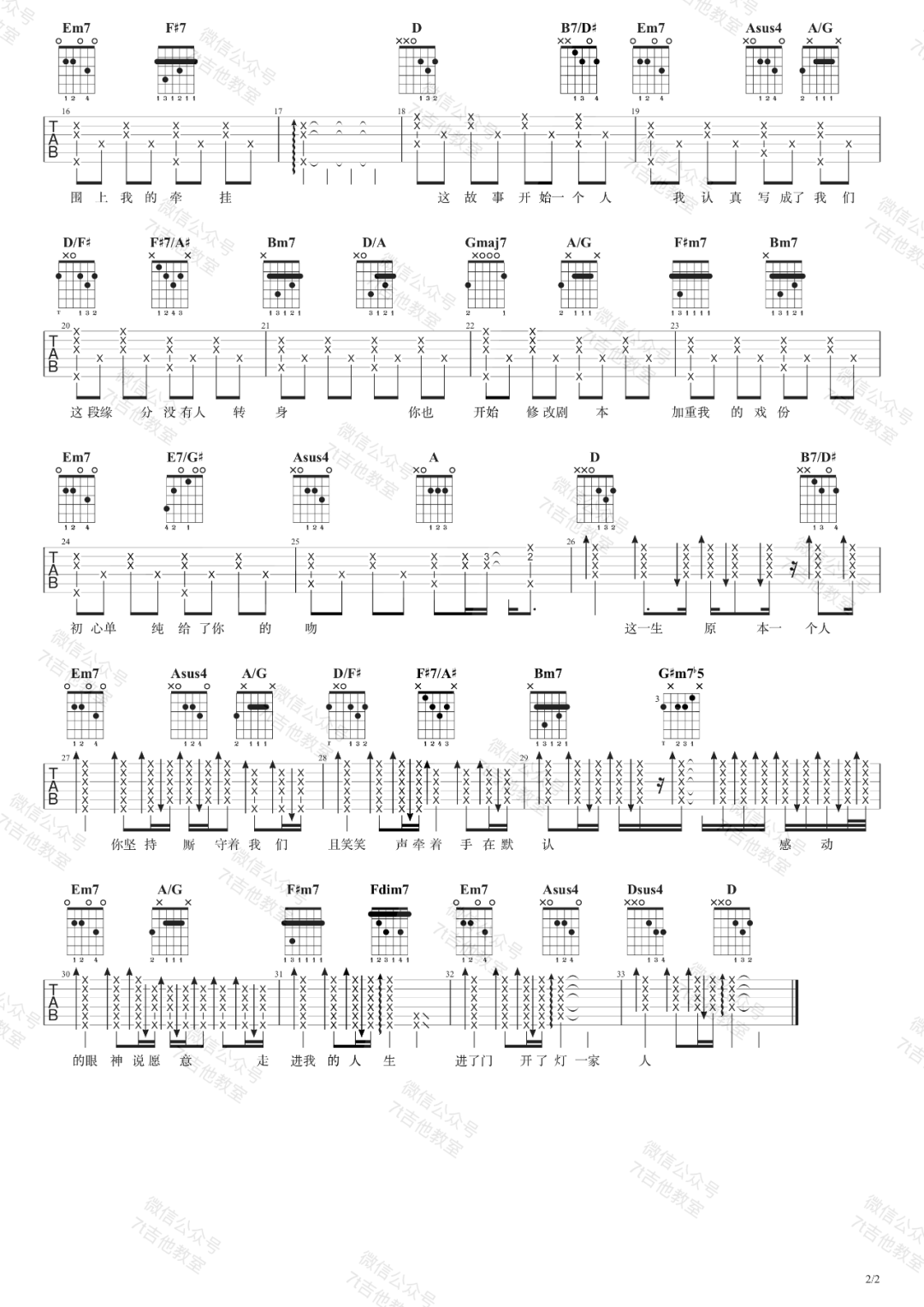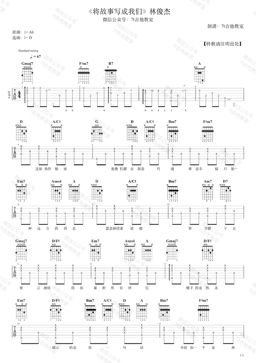 曲谱介绍: 林俊杰《将故事写成我们》吉他弹唱谱,采用D调指法编配,共有2张高清图谱,免翻页排版设计。