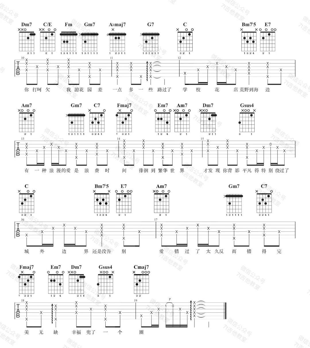 曲谱介绍: 《兜圈》吉他谱的原调是D大调,整个曲谱选用C大调的指法来编配,视频里是降半音调弦,没有使用变调夹,适合音域较低的男生~想唱原调的童鞋用标准音调弦,变调夹夹在第2品就可以哦!女生建议夹在3至5品~相信有一部分朋友兜兜转转,回到原点,发现爱情也许就在这里,是不是一种很美好的事情呢?