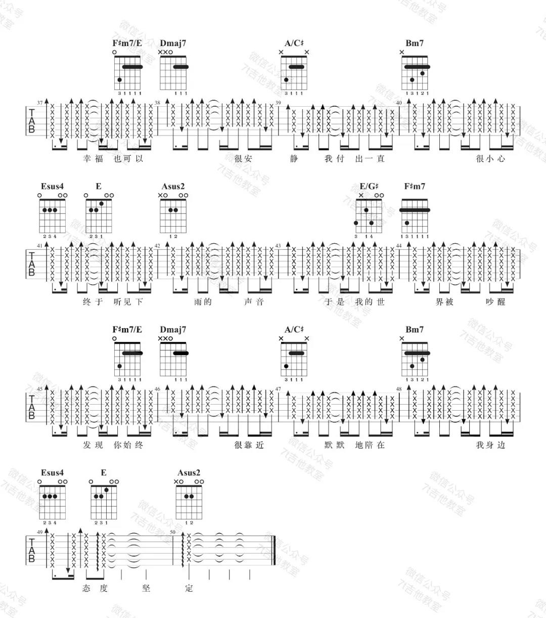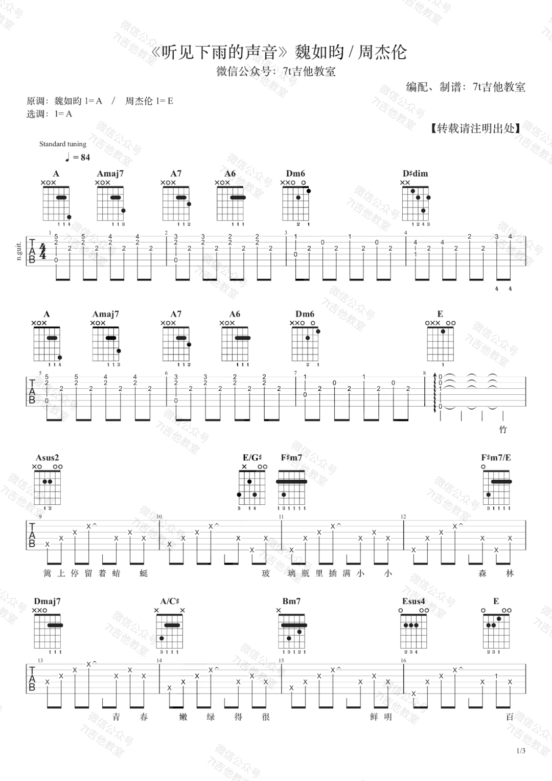 曲谱介绍: 由7T吉他教室编配制谱的《听见下雨的声音》吉他谱,共有3张高清图片谱,魏如昀版本的原调是A大调,周杰伦版本的原调是E大调,7T老师是A大调的指法来编配,视频里是标准音调弦,变调夹夹在第2品,适合音域较低的男生~女生如果音域较高可以不用变调夹直接唱原调,如果音域较低可以夹4到5品然后低八度来唱哦~ 《听见下雨的声音》吉他弹唱演示视频