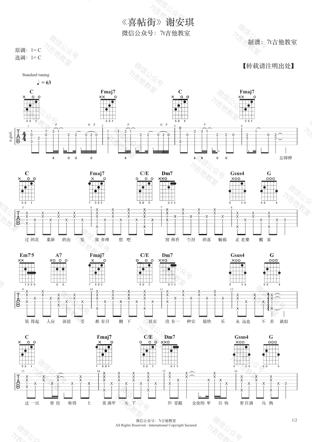 曲谱介绍: 《喜帖街》吉他谱的原调是C大调,这个版本也是按照原调用C大调的指法来编配,示范视频里是男声演唱,标准音调弦,使用变调夹,夹在第2品,适合音域较低的男生。