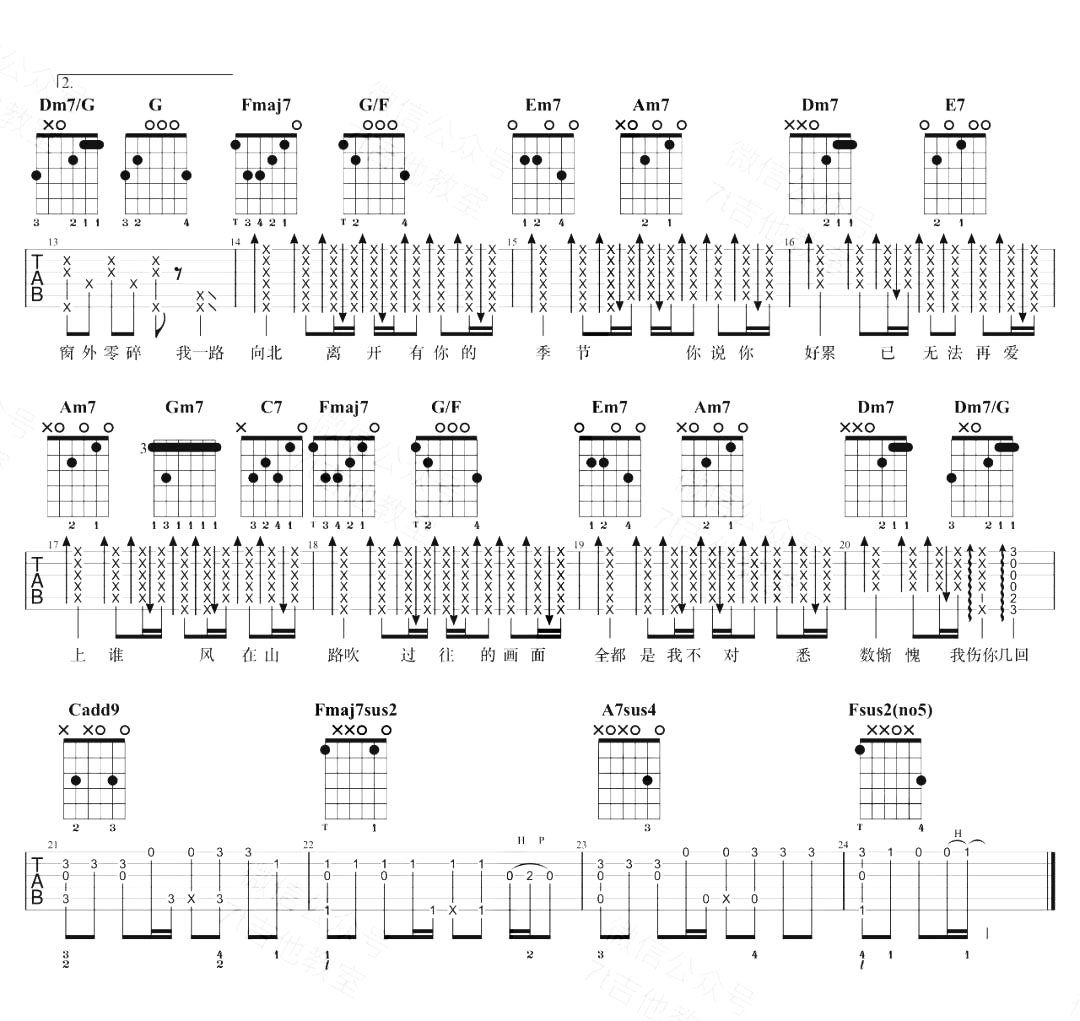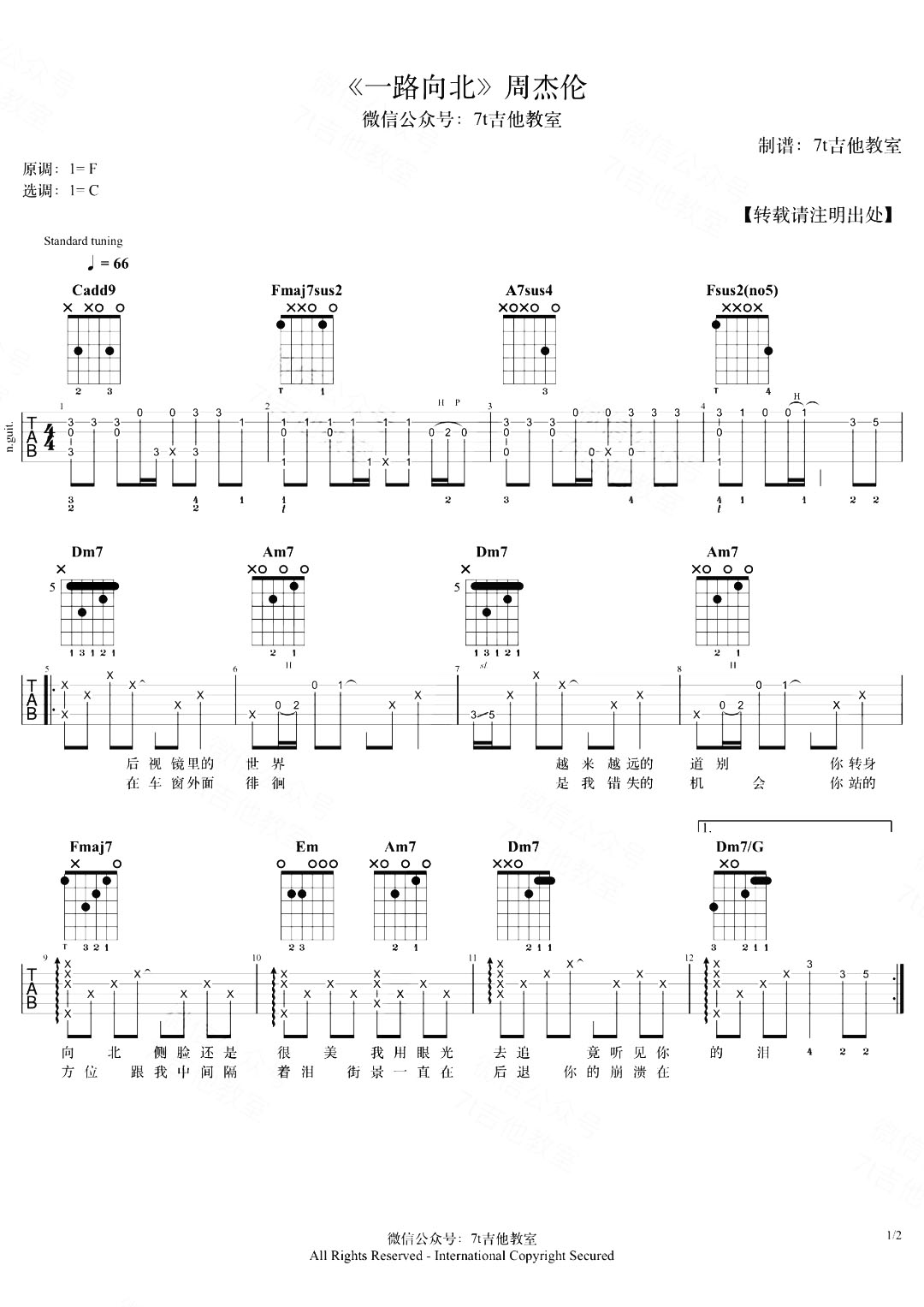 曲谱介绍: 周杰伦《一路向北》吉他谱【精编原版】,原调是F调,这个版本选用的C调编配,使用的标准调音调弦,速度66BPM,节奏4/4拍,难度适中,大家可参考下方《一路向北》的弹唱演示视频结合练习。 《一路向北》吉他弹唱演示视频
