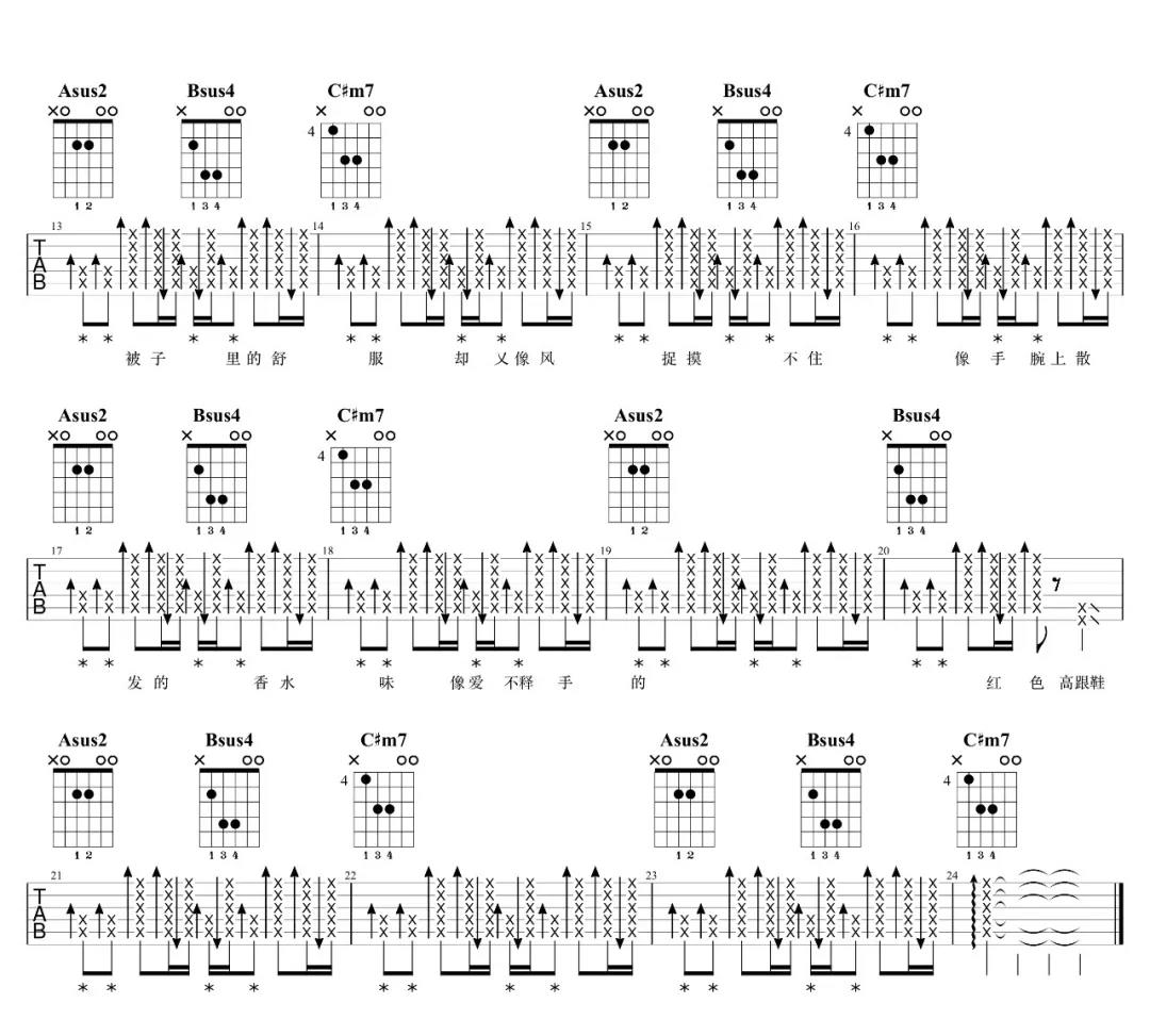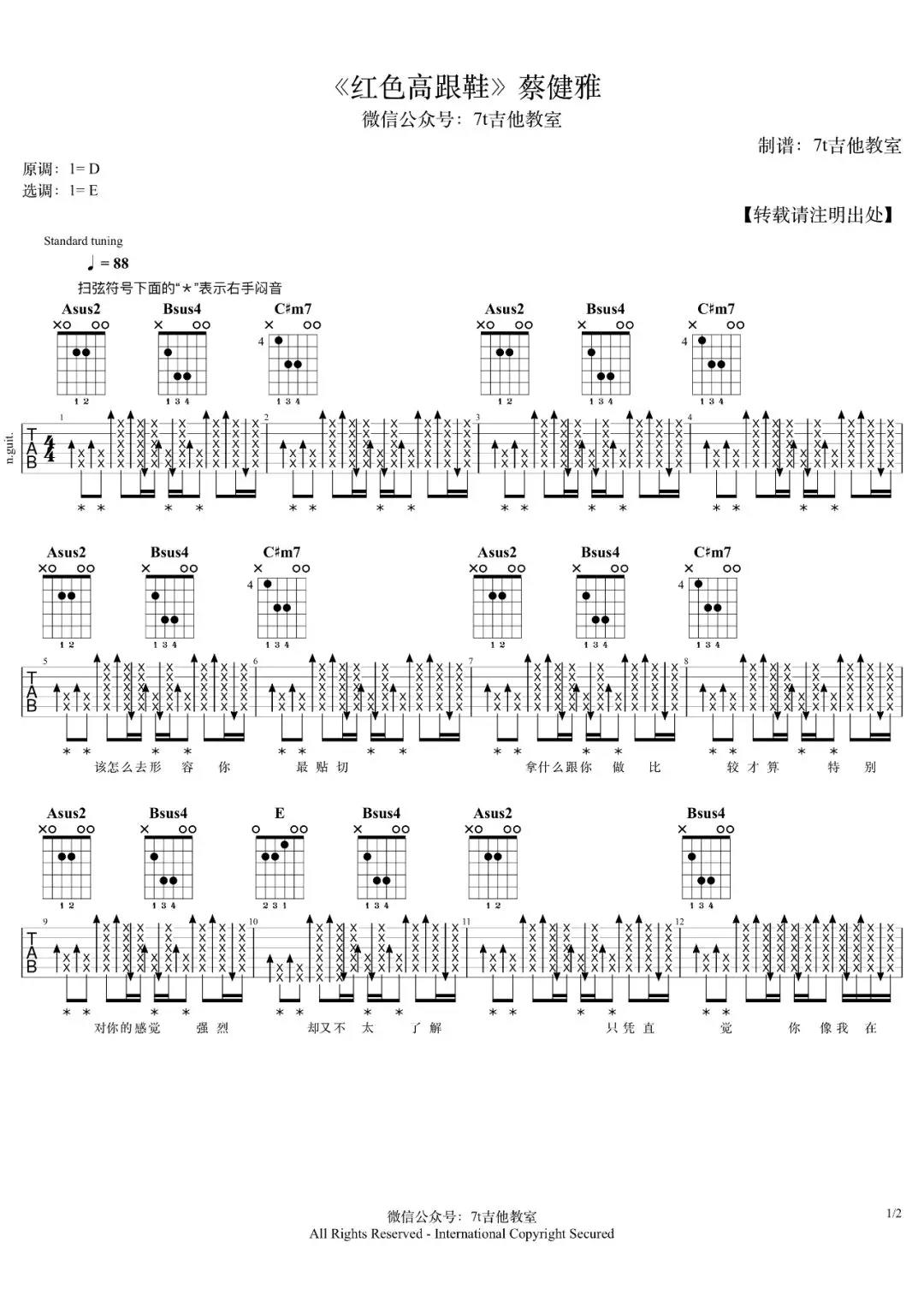 曲谱介绍: 《红色高跟鞋》这首歌的原调是D大调,这个版本用的是E大调的指法编配来弹唱,用到的和弦很少。右手有闷音扫弦的混合节奏,大家可以根据视频中的弹奏演示方法来弹奏,这首歌要说难点的话,可能就是在扫弦的节奏上了,大家可以可以多多把精力花在扫弦部分,节奏成熟了,这首歌自然就成型了。