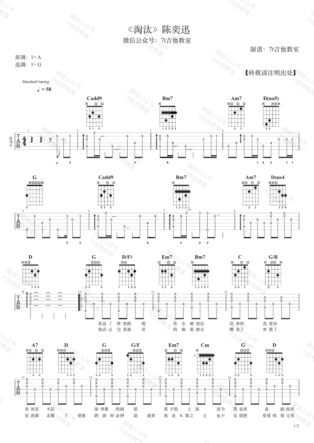 曲谱介绍: 陈奕迅《淘汰》吉他谱,共有2张高清图片谱,原版的的去掉是A大调,演示是用的G大调的指法来编配,使用变调夹夹在第2品,节奏4/4拍,速度58拍每分钟,下方附有《淘汰》前奏部分的弹唱演示视频!喜欢的朋友赶紧拿起吉他练习练习吧,这个版本编配非常接近原版,十分推荐。 《淘汰》前奏吉他演示视频