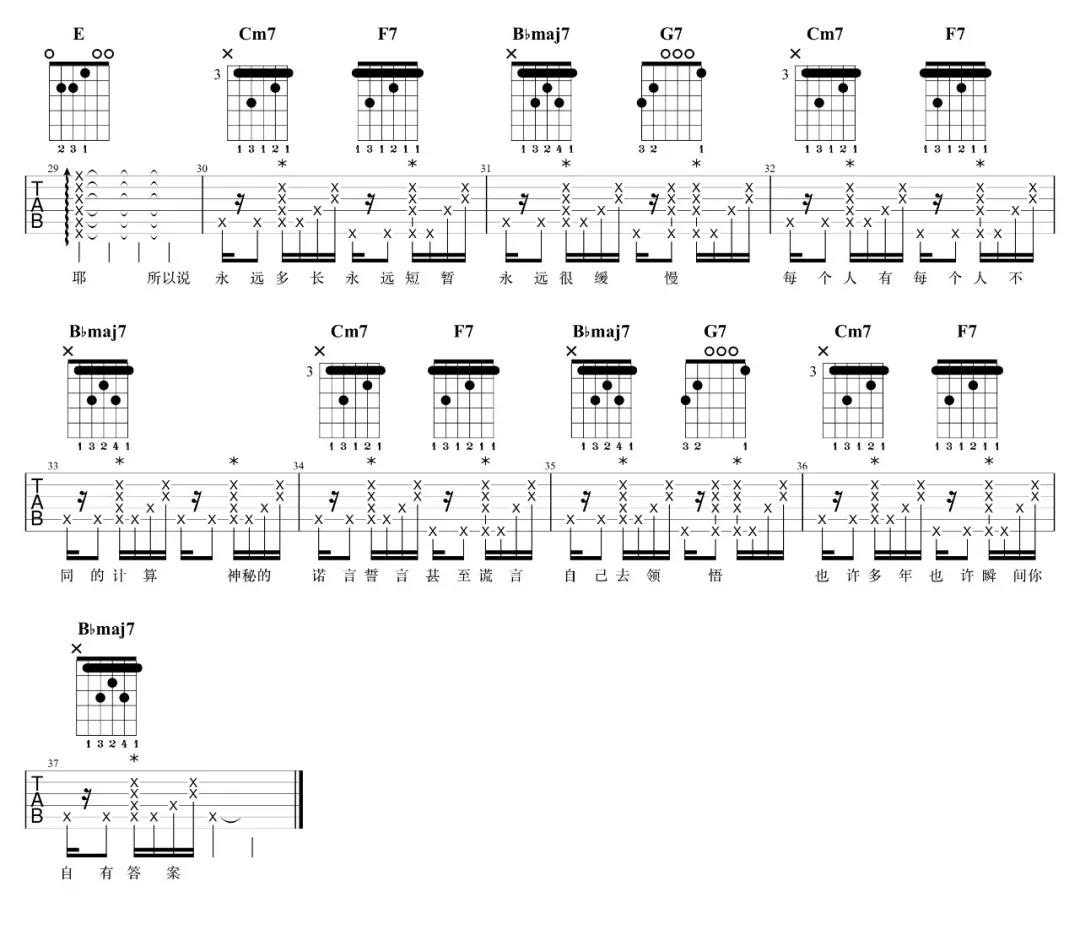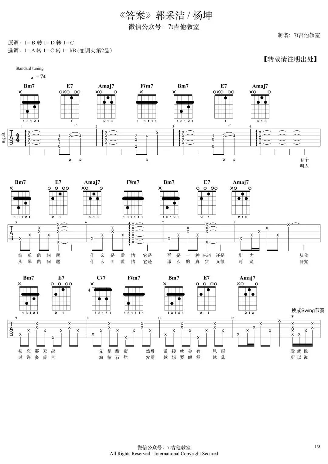 曲谱介绍: 《答案》吉他谱整首歌转了两次调,夹第2品按照这个谱子就能弹出原调哦!这首歌是杨坤郭采洁合唱的一首歌曲,拍弦节奏型可能是很多初中级选手的难点之处,所以后面有个相关的讲解视频。