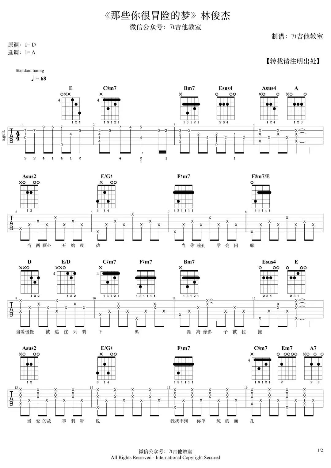 曲谱介绍: 《那些你很冒险的梦》原调是D大调,这个版本的编配是选用的A大调的指法来,大家可以使用变调夹夹第5品就是原调了哦