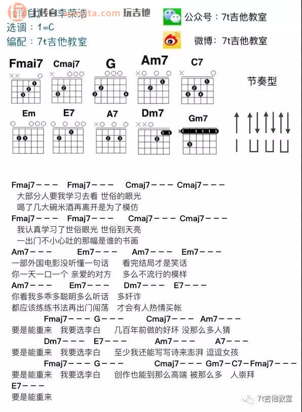 曲谱介绍: 李荣浩《李白》吉他弹唱谱,采用C调指法编配,共有1张高清图谱,免翻页排版设计。