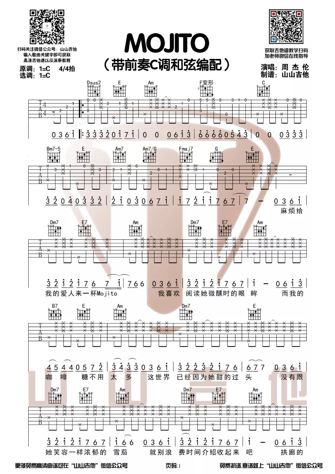 曲谱介绍: 《MOJITO》吉他谱带前奏,原调是C调,4/4拍,这个版本也是选用C调编配,这首歌不管是节奏还是和弦的跨度还是挺大的,对于新手来说估计还是有点难。MOJITO是周杰伦最新的一首单曲,异域风情的轻松节奏是这首歌完整的色彩,所以拍弦应该把这首歌玩得很轻松愉悦就对了,这边玩吉他小编也是最快的速度拿到了山山吉他提供的MOJITO吉他谱版本。