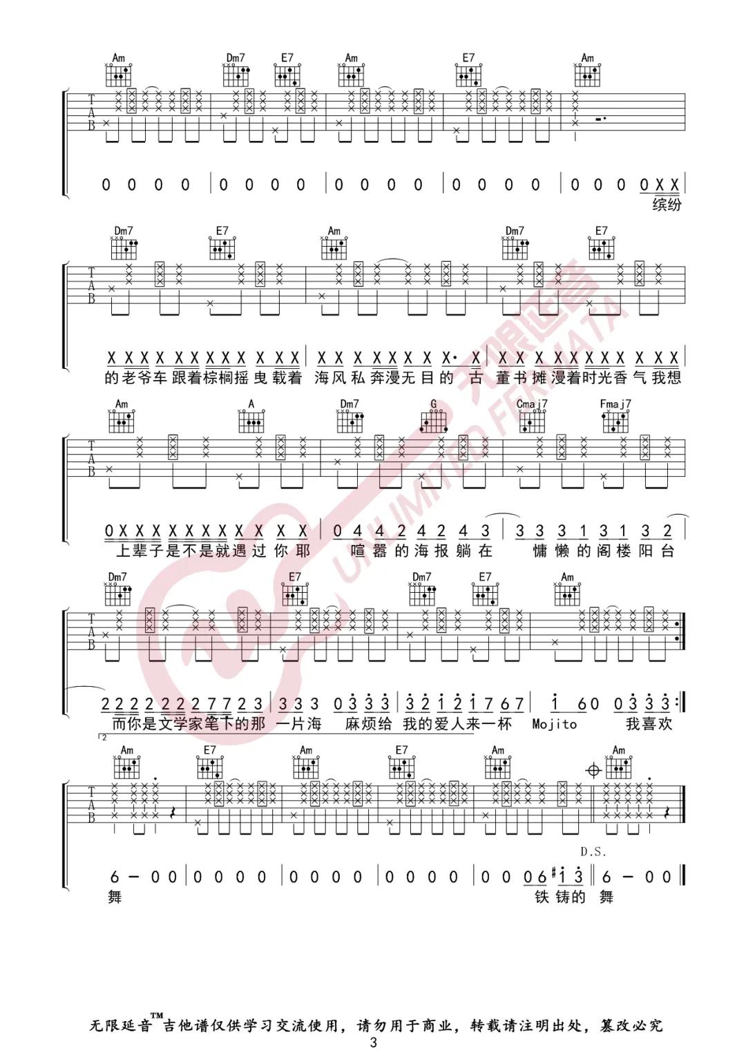 曲谱介绍: Mojito吉他谱选用C调编配,这个版本是由无限延音提供编配,中间拍弦是这首歌的灵魂,所以我觉得这首歌是一首很有意思的玩乐版吉他歌曲。这一首歌是周杰伦全新首发的新歌,这首歌的命名也来自古巴最著名的鸡尾酒“mojito”莫吉托,周杰伦也是特地前往古巴拍摄MV,为这首歌增加了十足的异域风味。 《mojito》原版MV歌曲视频试听 《mojito》吉他谱原版: