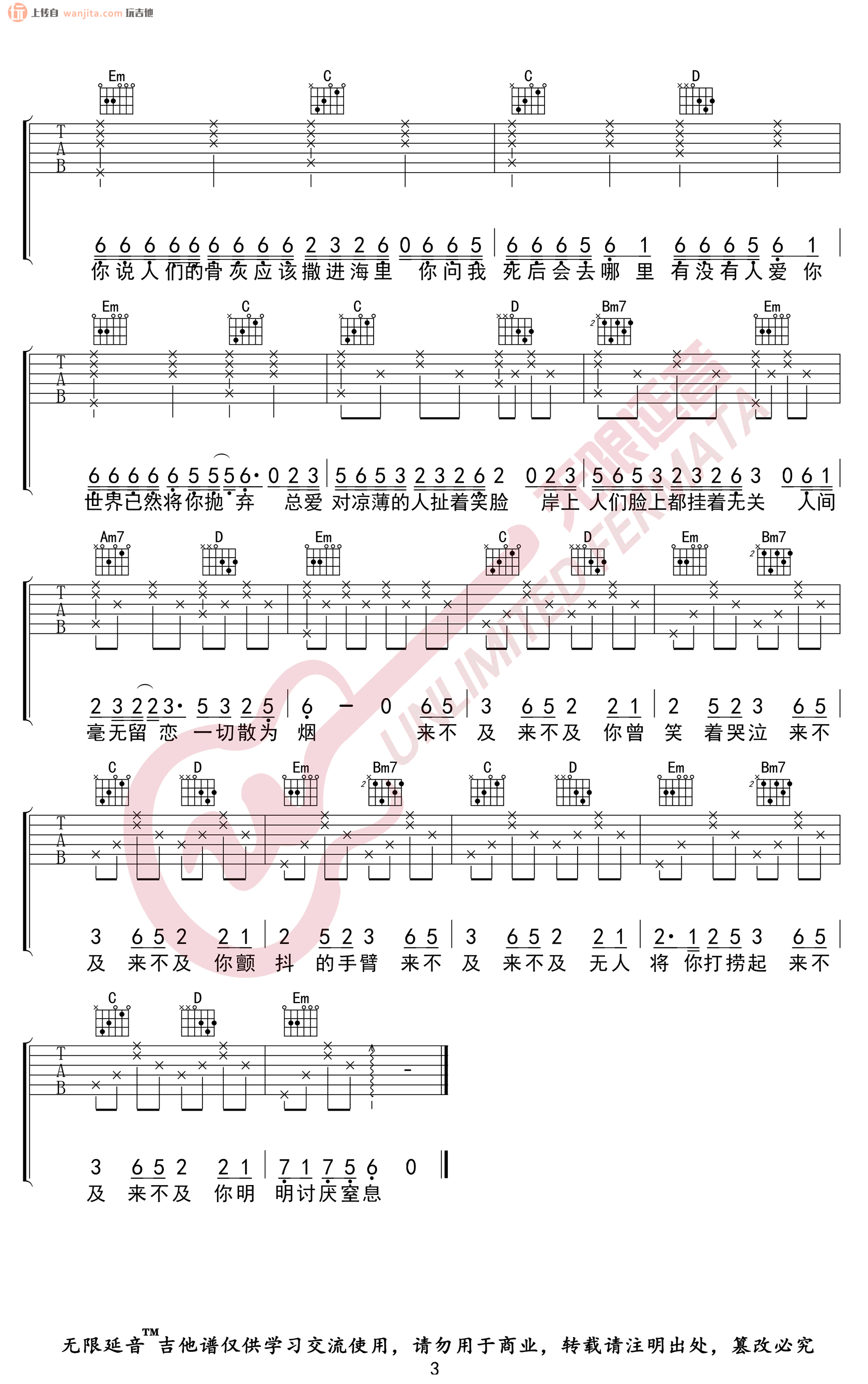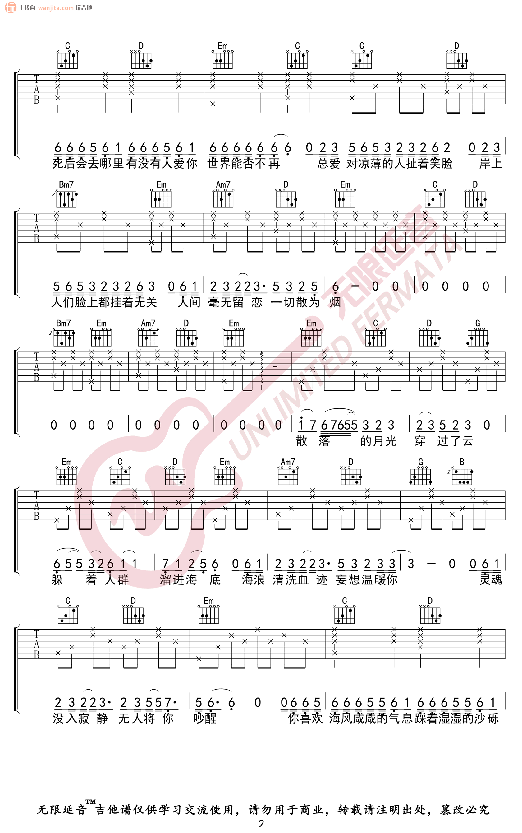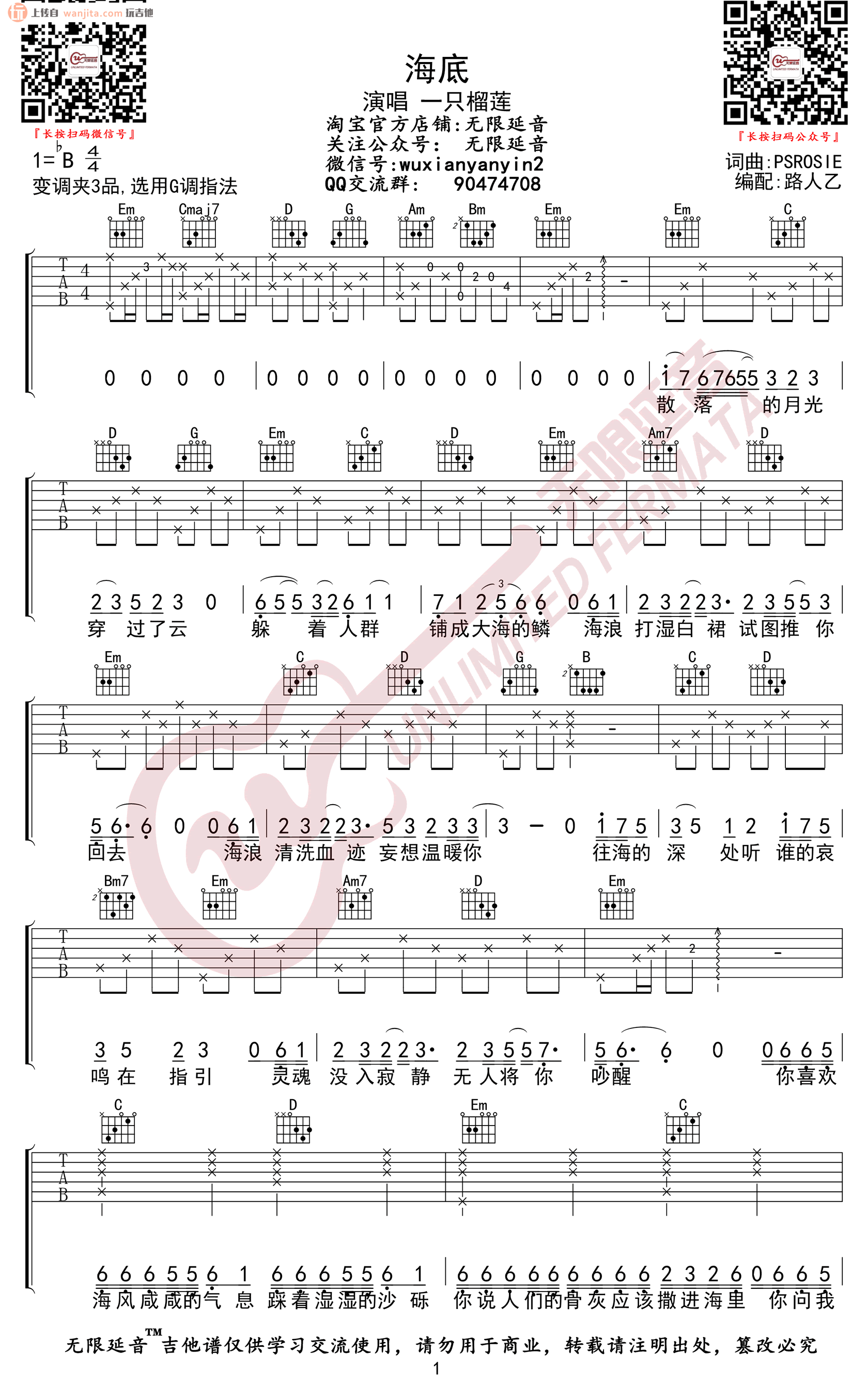 曲谱介绍: 一支榴莲《海底》吉他谱原调bB调,4/4拍,这个版本选用G调指法,变调夹夹在三品,无限延音提供编配,常规的分解和弦,没有任何难处,新手也可以弹唱,这首歌的关键就在于唱功上面了,匹配好的唱功,这个版本的谱子一定可以把这首发挥到极致。 翻唱版《海底》DEMO,仅供演唱参考