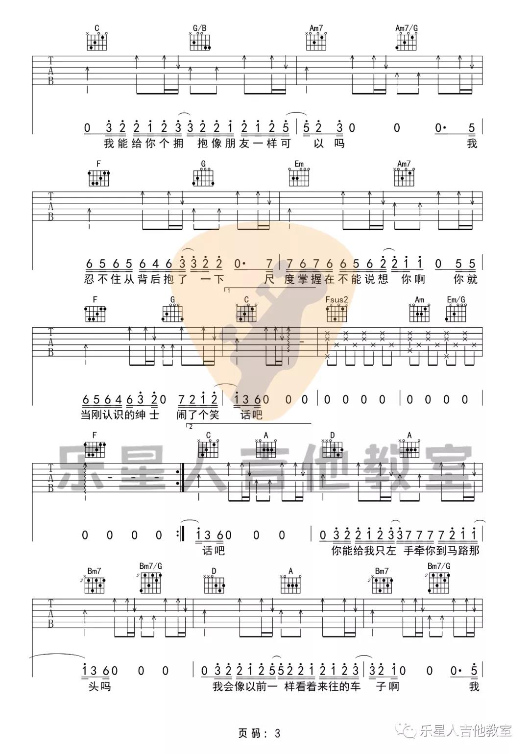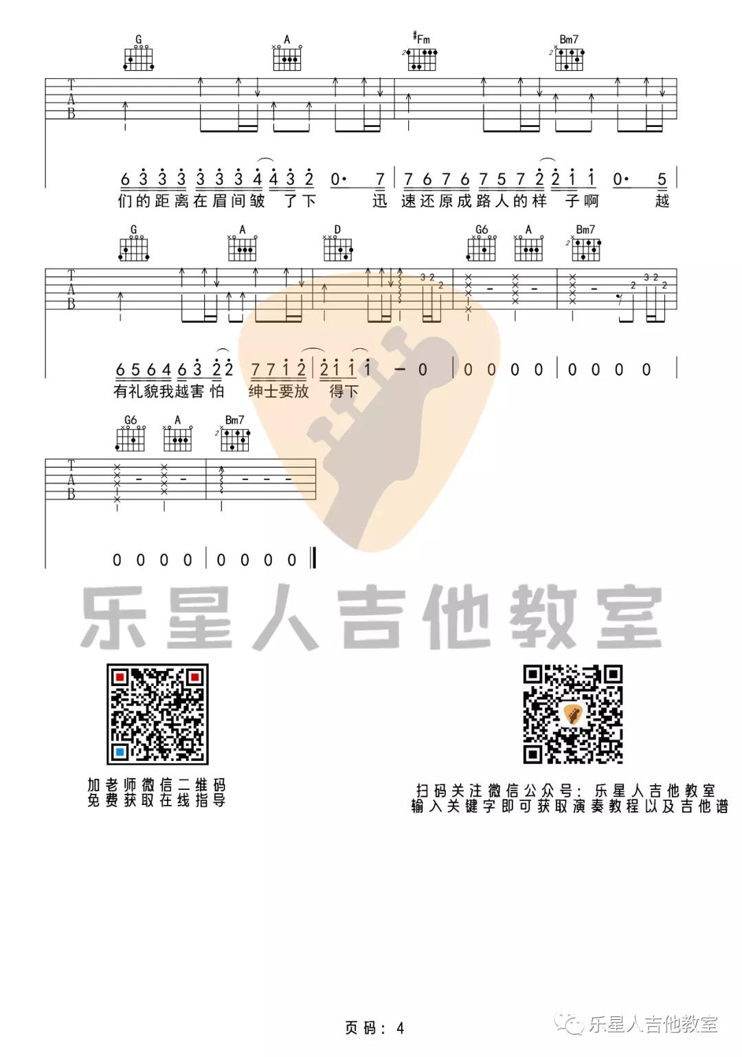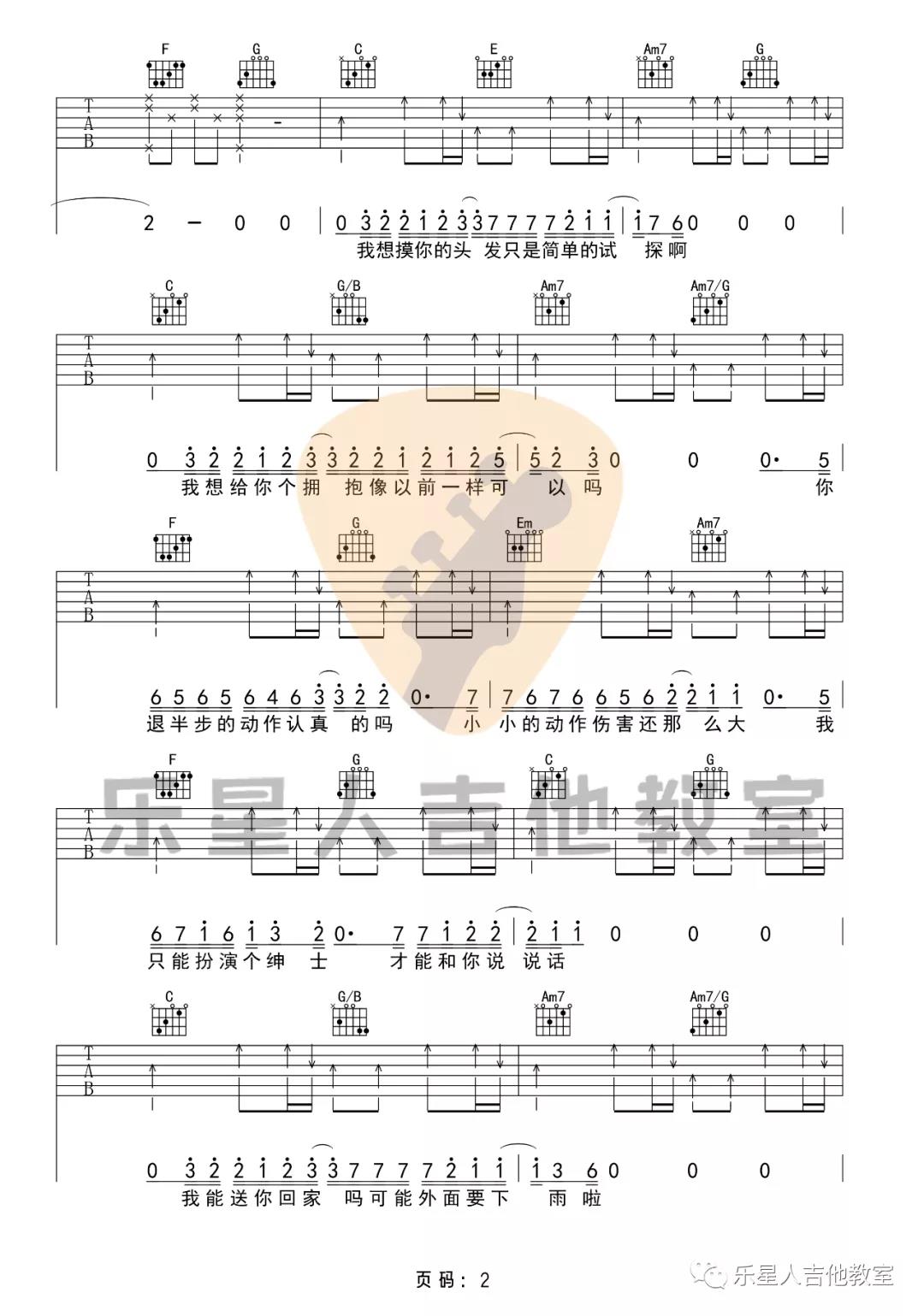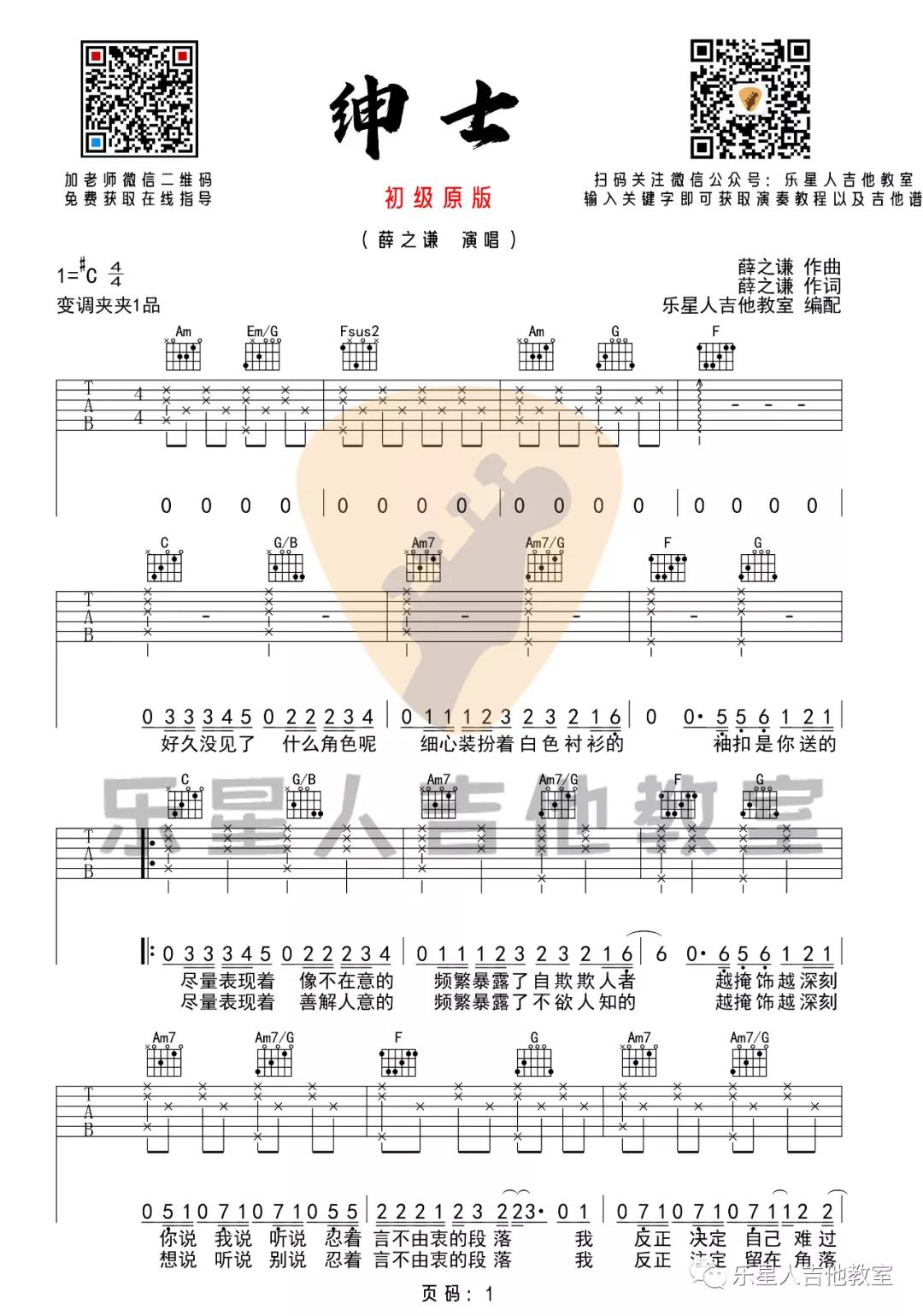 曲谱介绍: 《绅士》吉他谱原调是选用#C调,本曲谱是选用的C调指法,大家可以将变调夹夹在第一品,即可还原原调,和弦和节奏都非常的简单,主要以常规的分解和弦和扫弦的方式处理所有节奏。