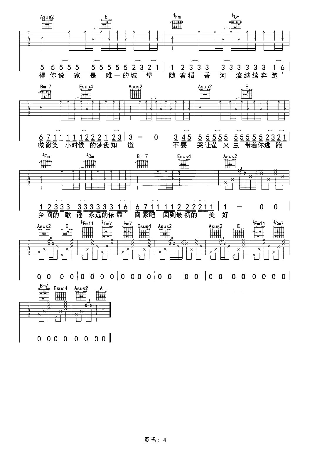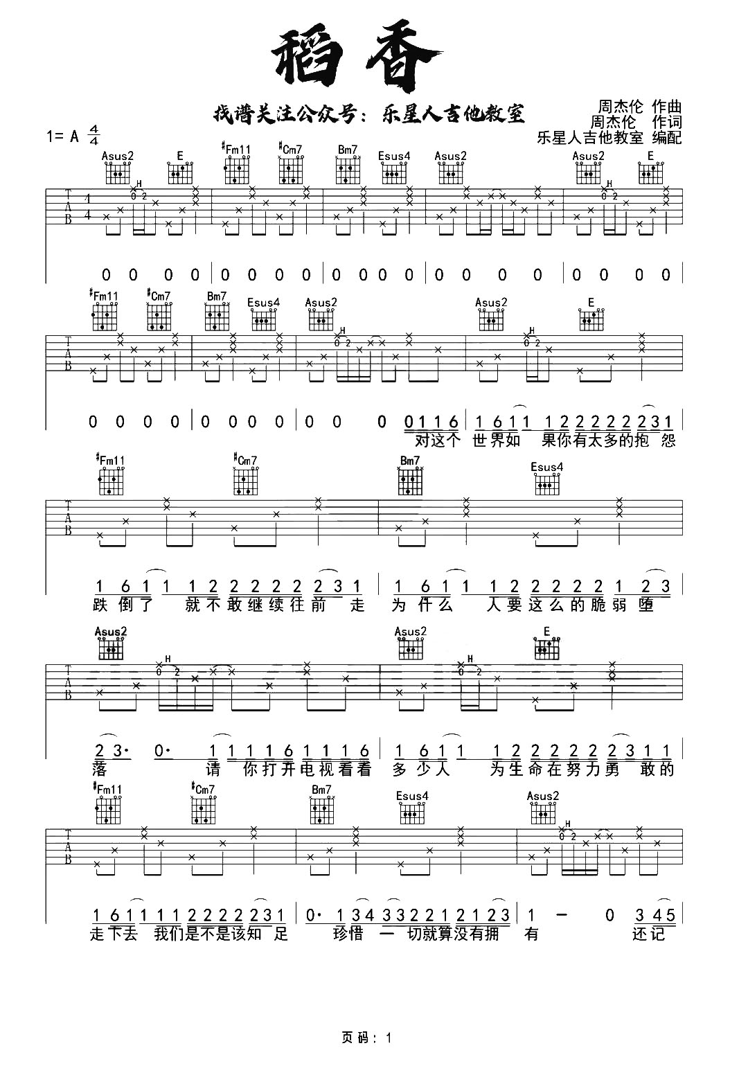 曲谱介绍: 周杰伦《稻香》吉他弹唱谱,采用A调指法编配,共有4张高清图谱。
