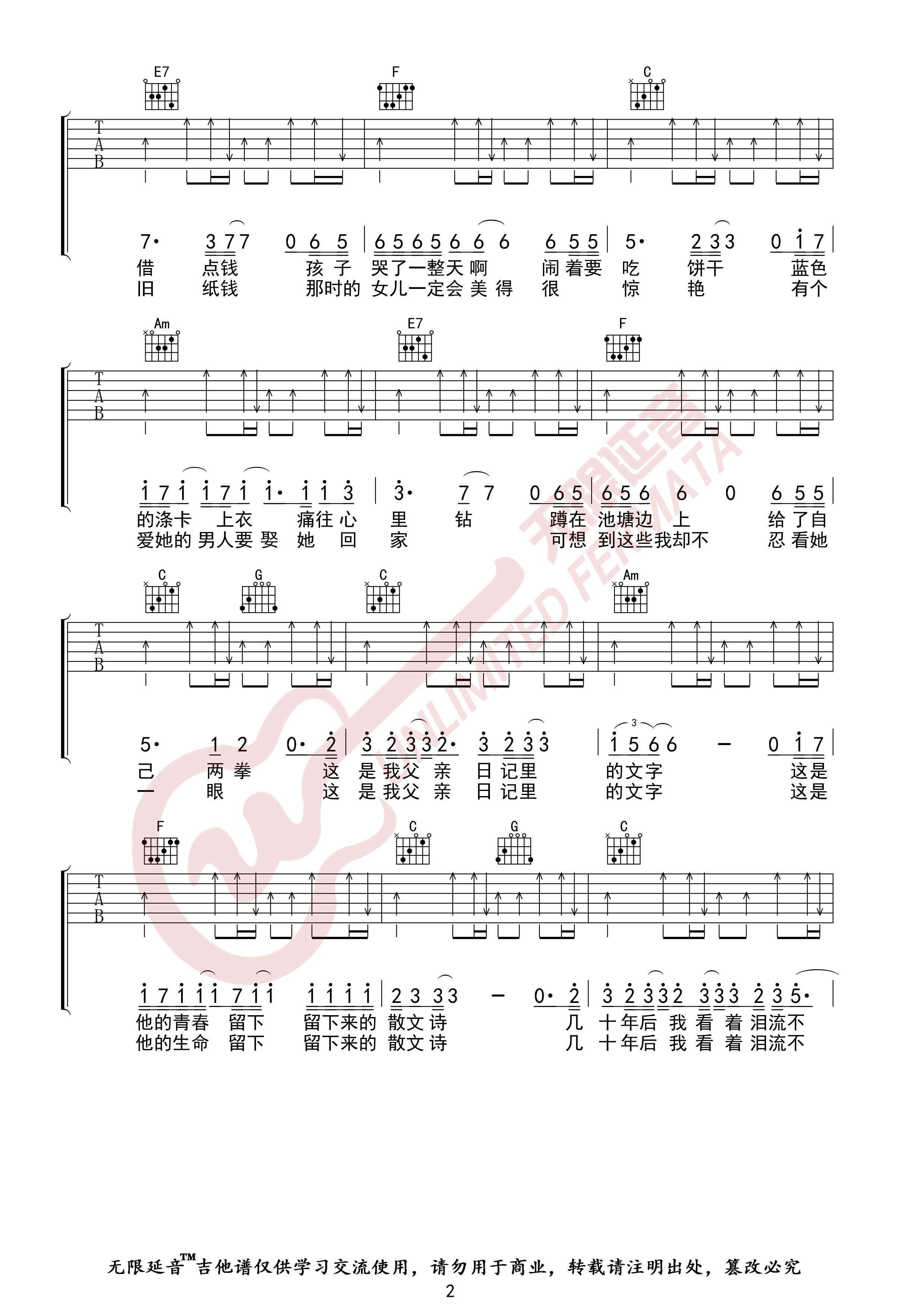曲谱介绍: 父亲写的散文诗是许飞的一首创歌曲,原调是E调 4/4拍,这首歌选用C调指法,变调夹夹在第4品即可,由无限延音提供吉他谱的编配