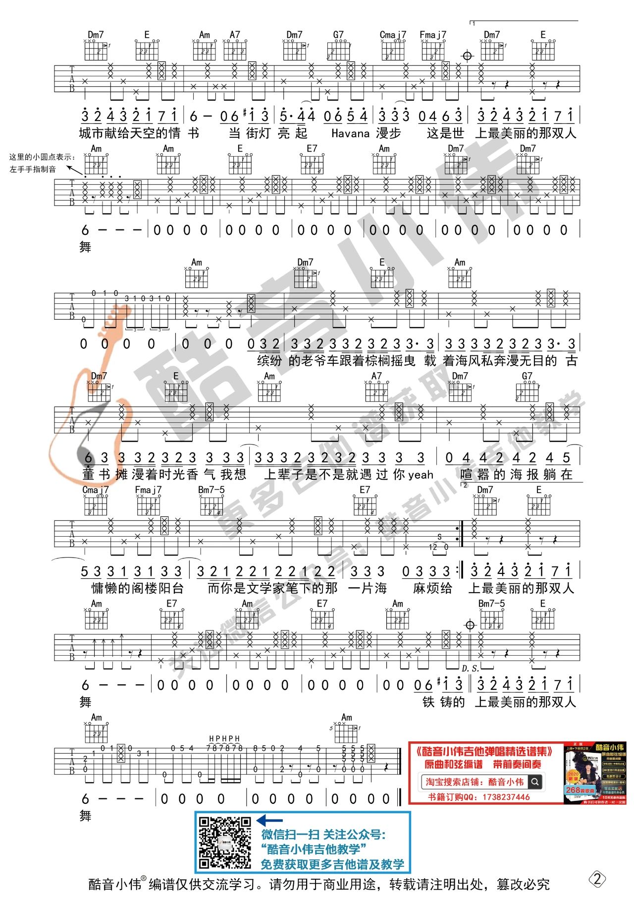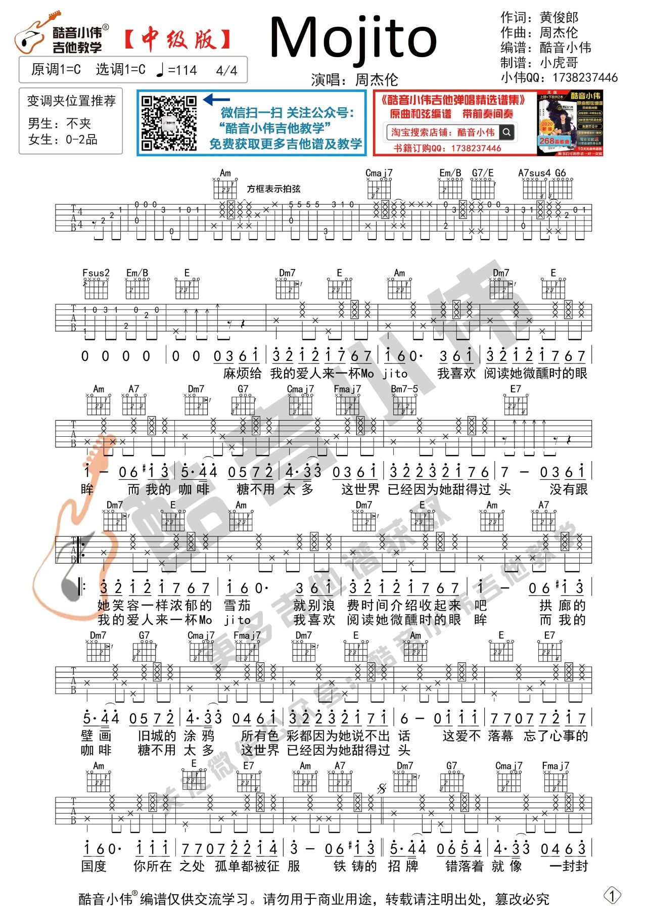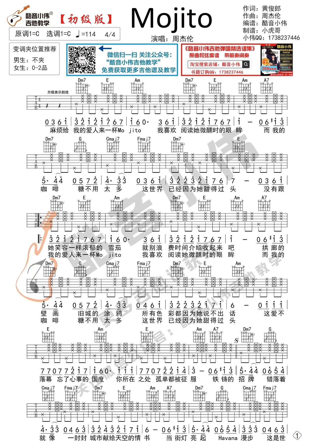 曲谱介绍: 这首《MOJITO》吉他谱,是来自酷音小伟编配,选用C调编配,主要的节奏来自于拍弦,总共提供了4张高清图片谱,分别有初级的版本和高级的版本,这样也方便喜欢这首歌的新手能够弹会这首最近很火的歌曲,页面中的视频弹唱示范是选的中级版本,所以我们也将中级版本的吉他谱放在了前面。 酷音小伟《MOJITO》吉他弹唱示范+教学完整视频(中级版) 《MOJITO》C调中级版本
