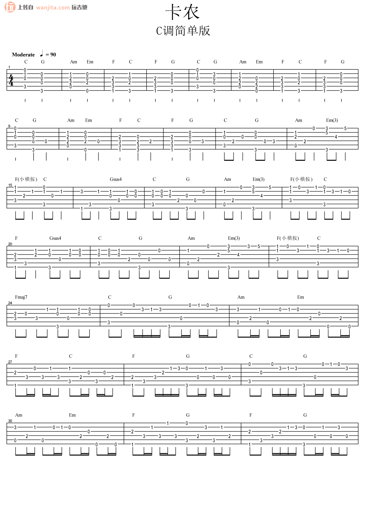 曲谱介绍: 吉他名曲《卡农》吉他独奏谱,采用C调指法编配,共有3张高清图谱。