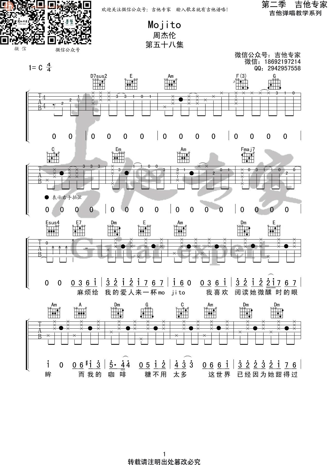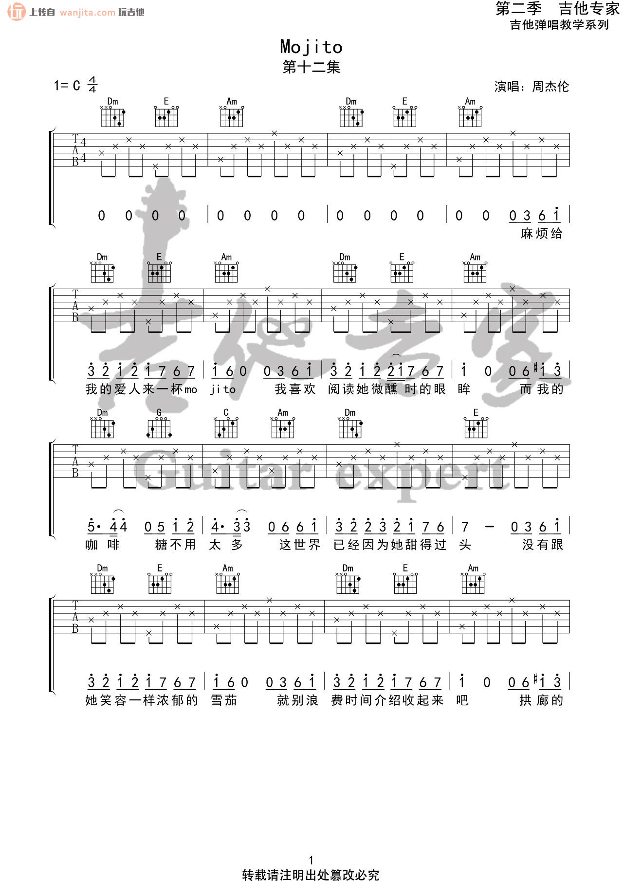 曲谱介绍: 周杰伦《Mojito》吉他弹唱谱,采用C调指法编配,共有6张高清图谱。