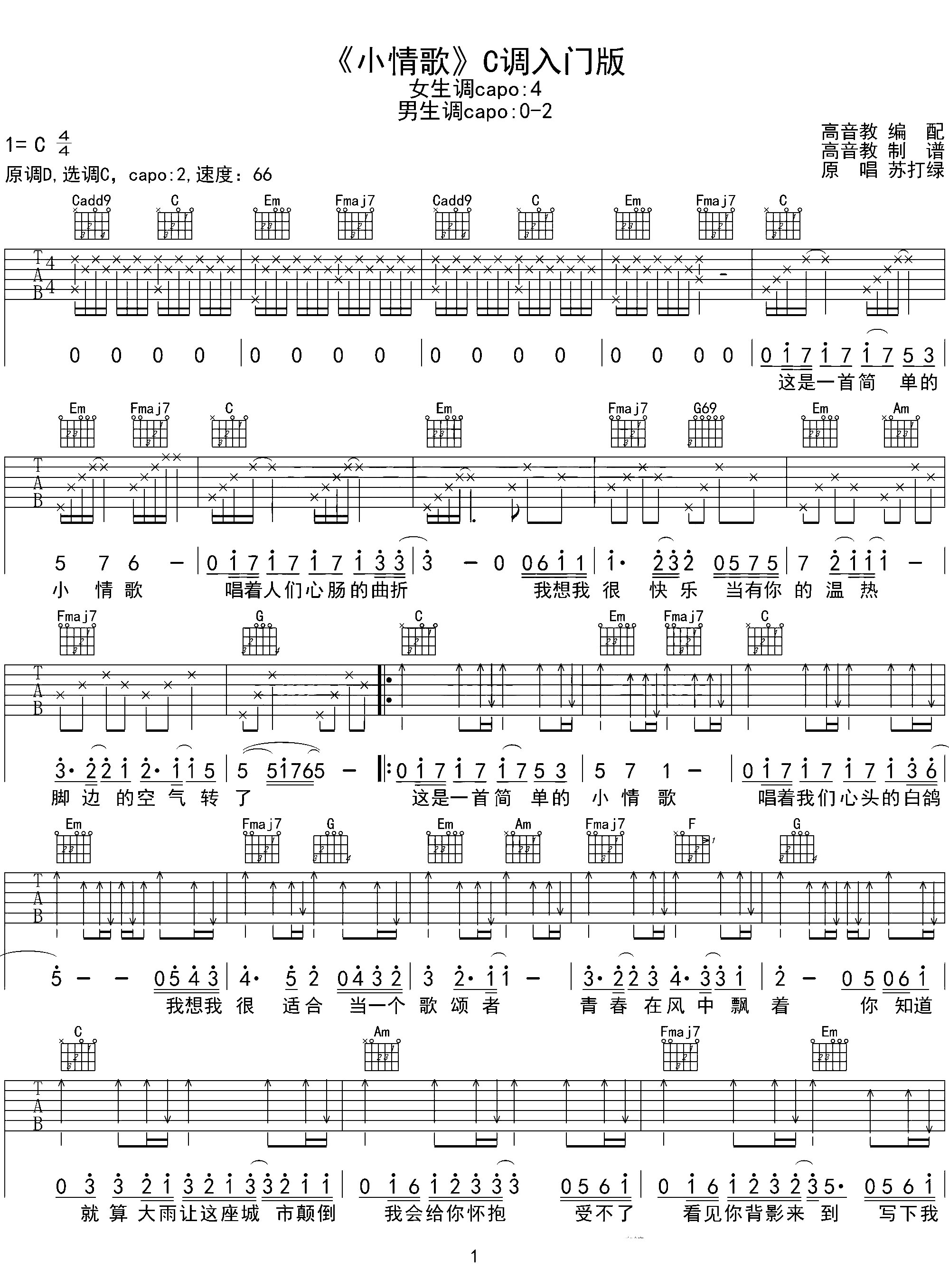 曲谱介绍: 来自苏打绿的《小情歌》吉他谱,由吴青峰唱作的代表作。这首歌曲原调是D调,选调为C调,4/4拍,变调夹可以夹在二品处,女生的话可以考虑夹在第四品处,小情歌的难点主要是在节奏上,这首歌编配速度达到了66,所以请大家练好手指分解和弦的速度较为关键,和弦部分还是比较简单。