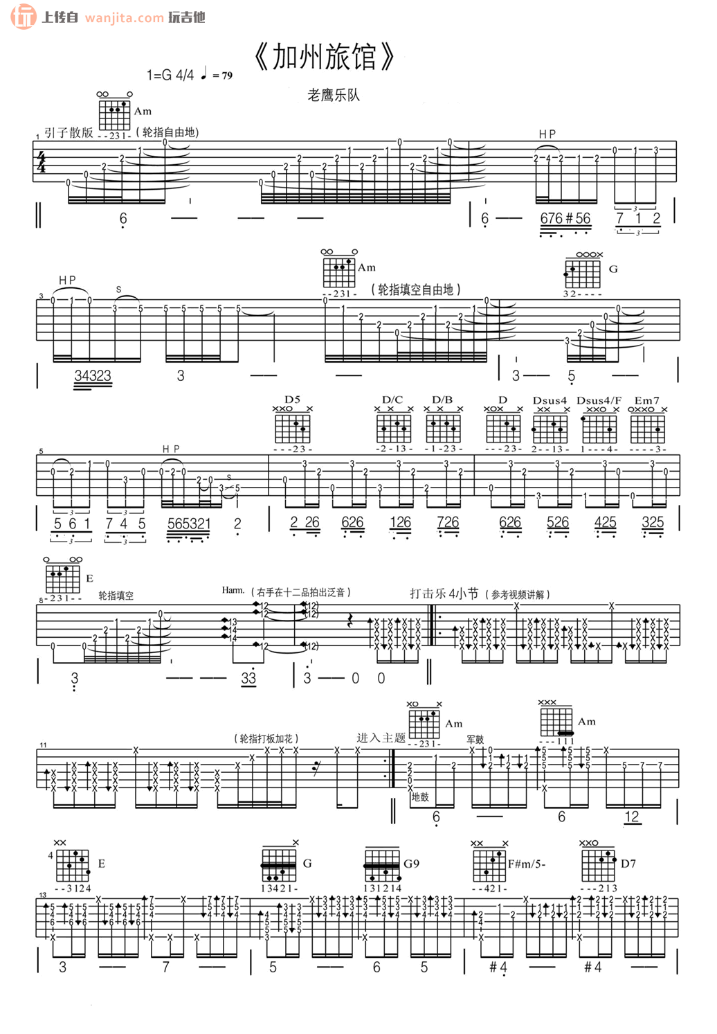 曲谱介绍: Hotel《HotelCalifornia(加州旅馆)》吉他独奏谱,采用G调指法编配,共有6张高清图谱。