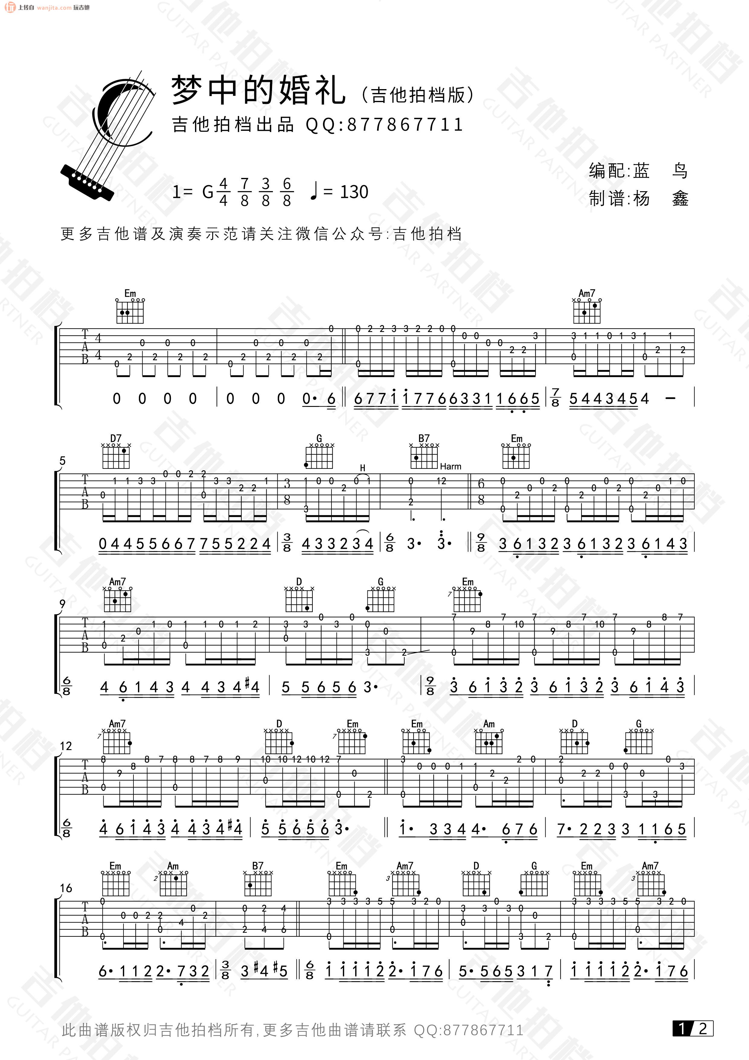 曲谱介绍: 吉他名曲《梦中的婚礼》吉他独奏谱,采用G调指法编配,共有2张高清图谱,免翻页排版设计。