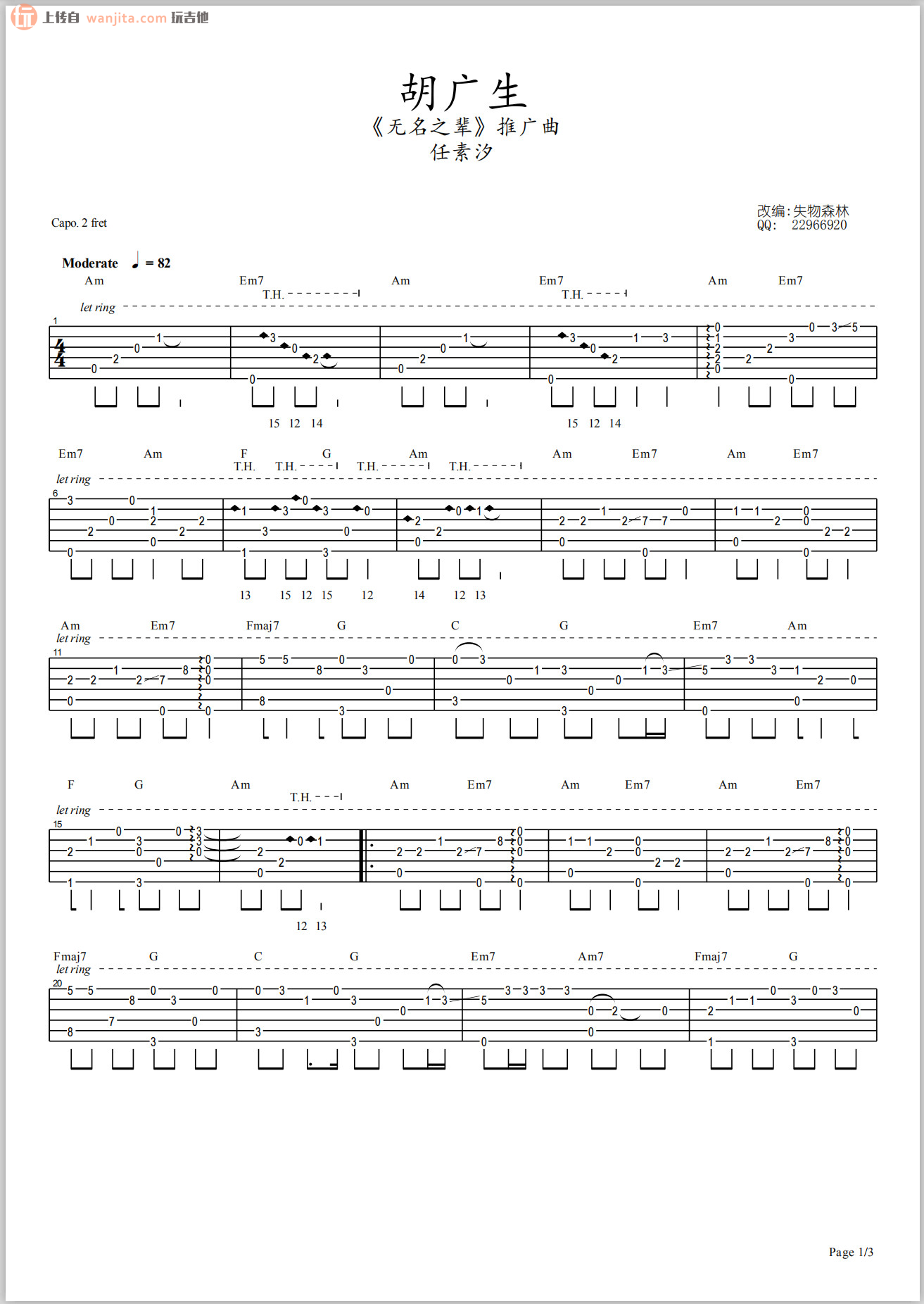 曲谱介绍: 任素汐版本的《胡广生》指弹吉他谱来自网友失物森林编配,这首歌标准调音,变调夹可以夹在第二品,后面有完整版指弹视频,喜欢的朋友可以参考示范。 《胡广生》吉他指弹视频示范