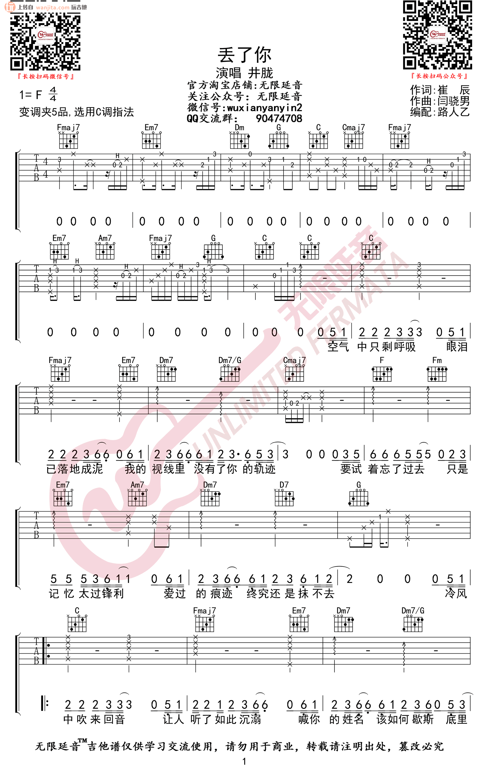 曲谱介绍: 井胧《丢了你》吉他谱原调是F调,4/4拍,选用G调指法,变调夹可以夹在第五品,无限延音的编配,这首歌包含完整的前奏部分,不过难点也就在这里,其实中间主歌的弹唱还是比较简单,所以如果想完整的弹唱好这首歌,还得把前奏好好的练习一下才行,喜欢的朋友赶紧试试吧!