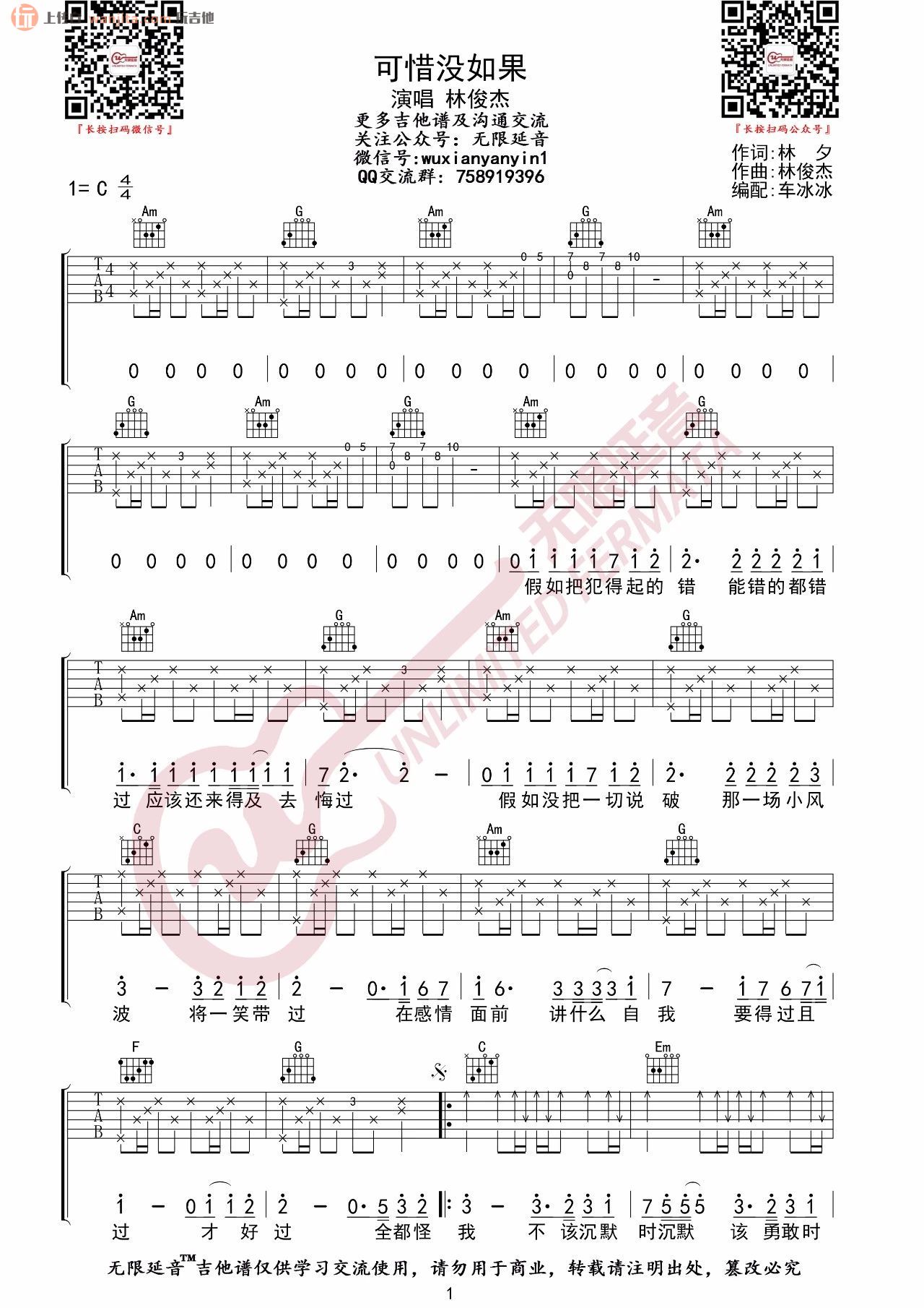 曲谱介绍: 《可惜没如果》吉他谱选用C调编配,这个版本采用分解和弦的方式,整首歌曲包含完整的前奏,除了前奏,可能就是节奏上的把控稍微需要注意,这个谱子的编配由无限延音分享。