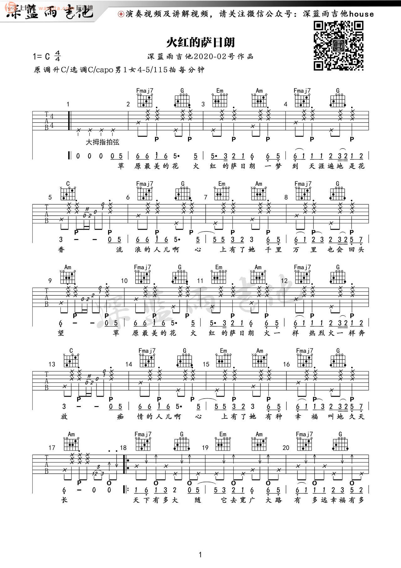 曲谱介绍: 《火红的萨日朗》吉他谱,这个版本由深蓝雨分享,C调弹唱六线谱,这个版本还是有点偏难,里面的节奏处理细节挺多的,尤其是尾奏的部分,朋友们可以参照深蓝雨的吉他弹唱视频演示,多花功夫在节奏上面,就可以很好的弹唱这首歌。 《火红的萨日朗》视频弹唱示范