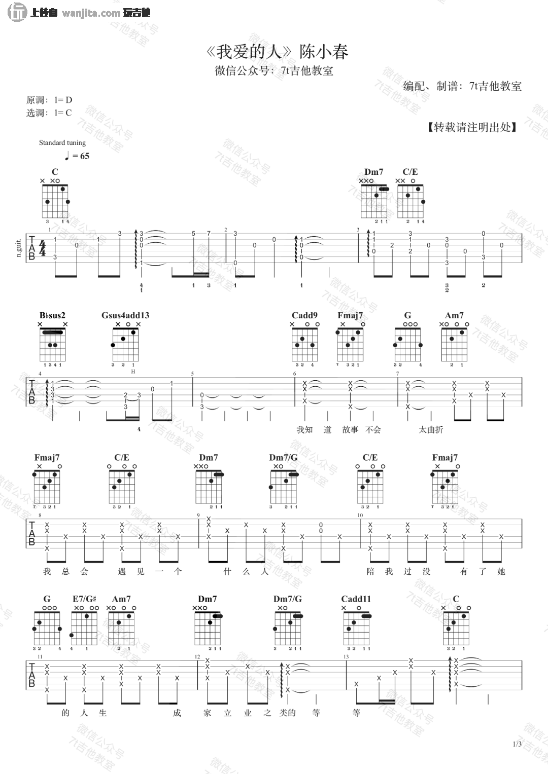 曲谱介绍: 陈小春的经典歌曲《我爱的人》吉他谱,非常温柔的悲伤情歌,这首歌原调是D大调,编配是用的C大调的指法,采用标准调音,没有使用变调夹,适合音域较低的男生。想唱原调的小伙伴夹第2品。常规的简单版本,前面的半分解和弦,后面随着节奏的起伏有扫弦的进入,会增加歌曲的层次感。 《我爱的人》吉他谱弹唱视频示范