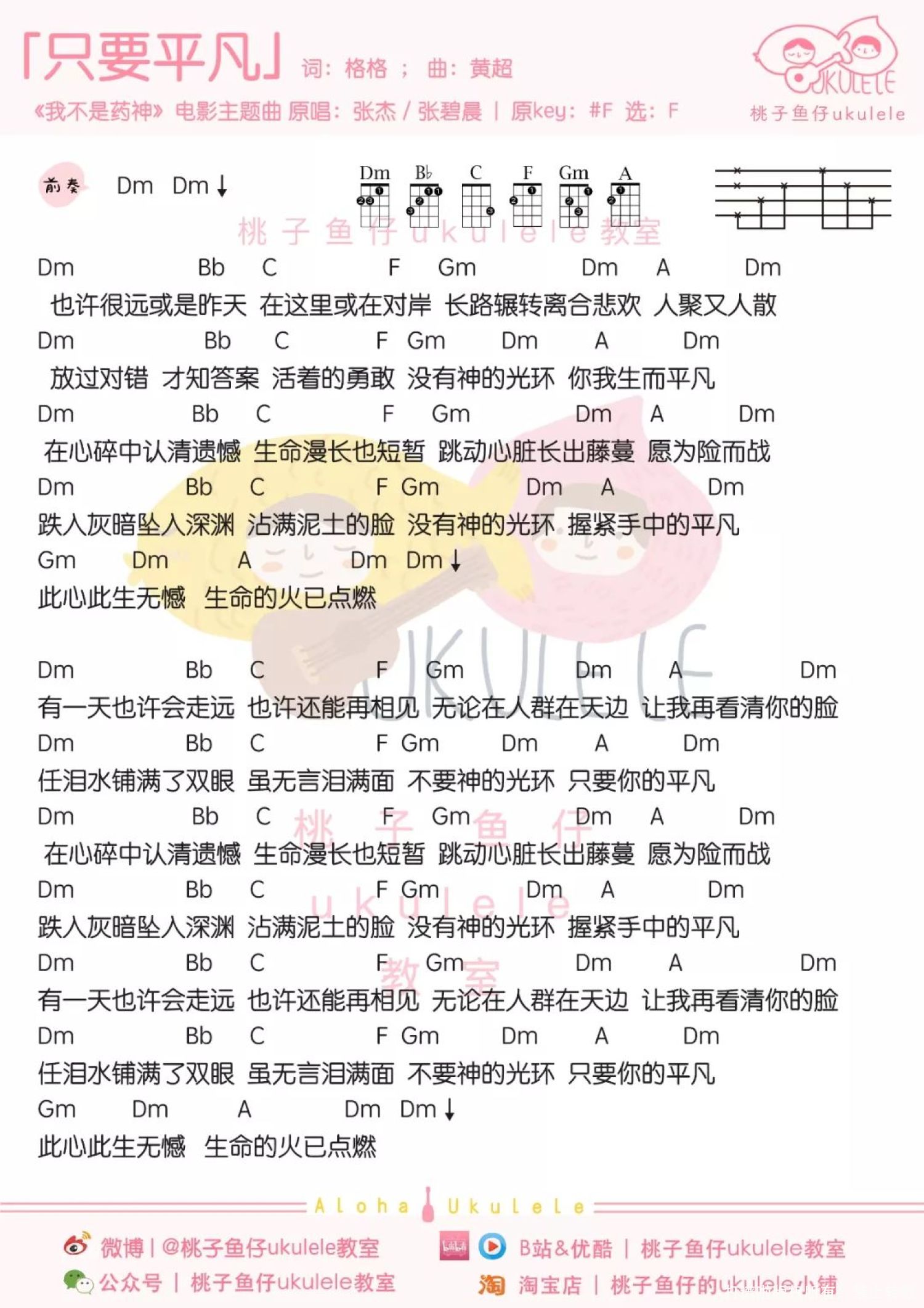 曲谱介绍: 这两天,《我不是药神》刷爆了朋友圈。这部口碑爆棚的国产电影,改编自一个真实的故事。 相信很多琴友已经看到这部电影了。前半部分真的令人捧腹大笑,后半部分又很沉重和难受。除此之外,电影的片尾曲<只要平凡>也很好听,以至于小编还听完了歌曲才肯离开。(抹着眼泪离开,太戳中人心了)   《只要平凡》尤克里里弹唱谱