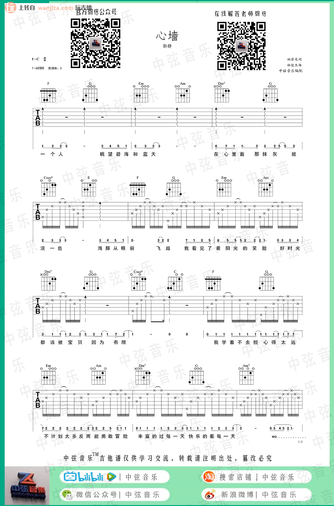 曲谱介绍: 心墙吉他谱,这首曲谱是来自中弦音乐的分享,选用C调编配,变调夹建议夹在第三品,这首歌一开始就按照郭静版本的原版处理节奏,歌曲的主歌部分,全分解和弦处理,副歌部分有扫弦处理,新手练习一下也比较好上手。