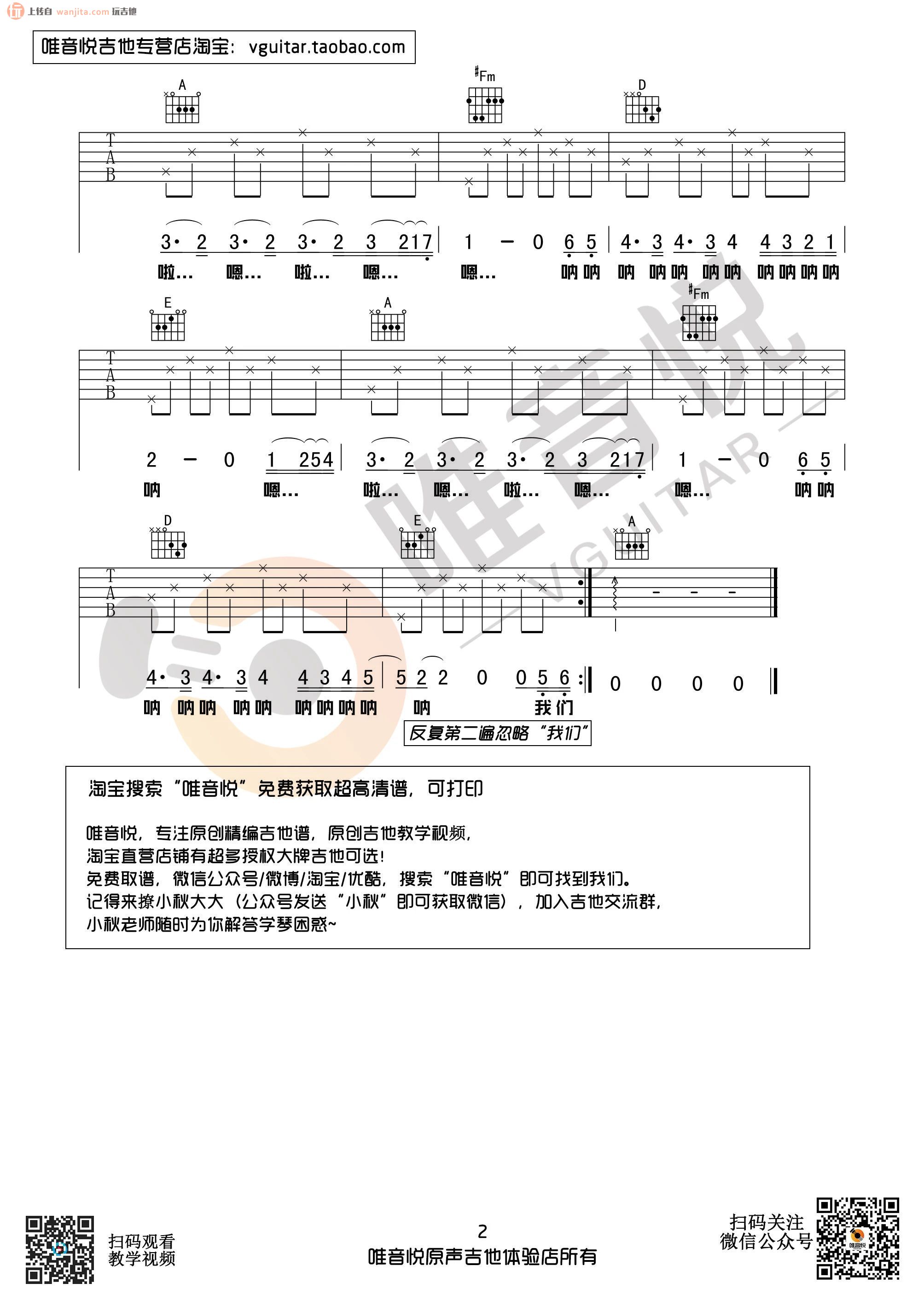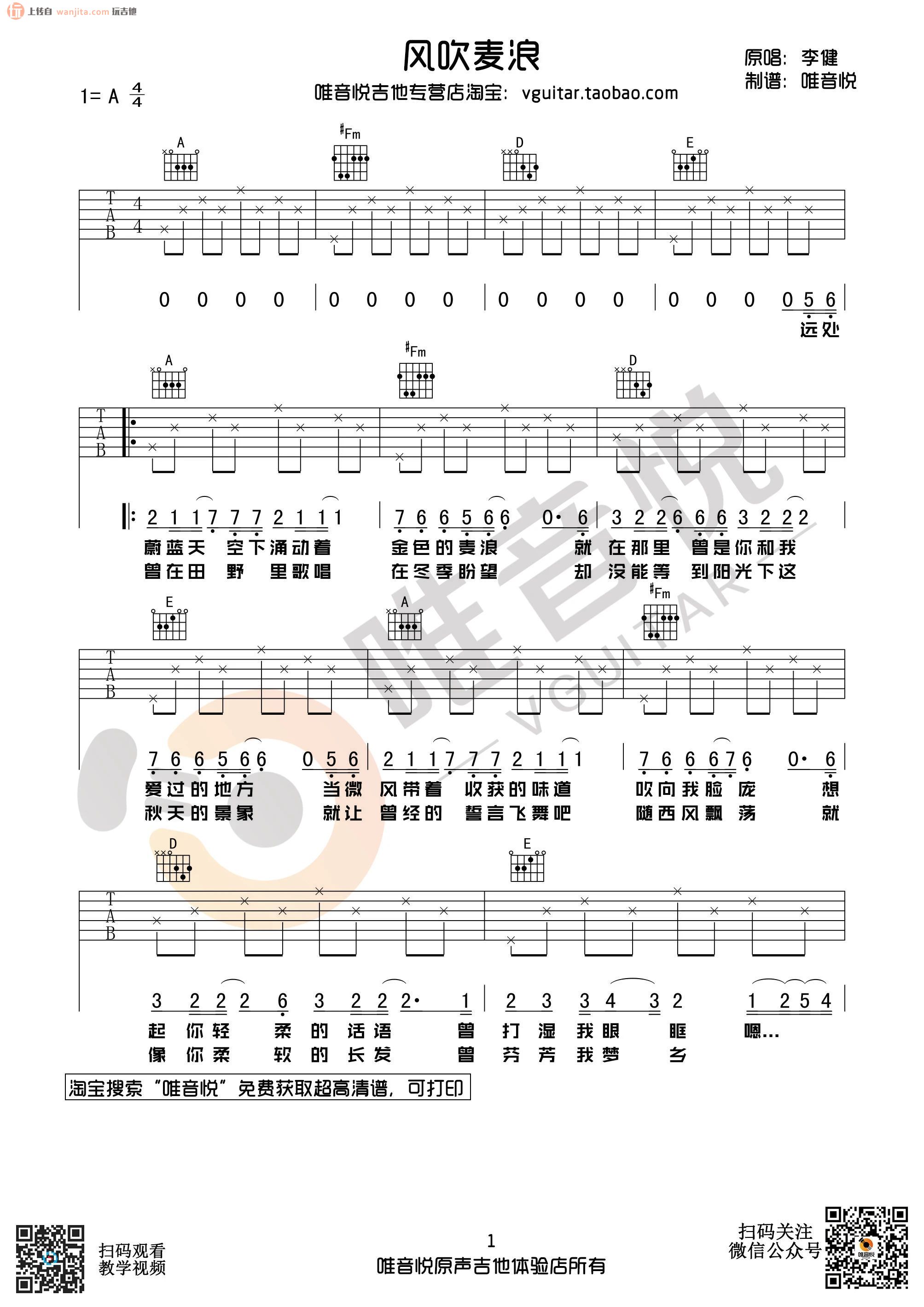 曲谱介绍: 由唯音悦分享的风吹麦浪吉他谱,选用A调编配,很简单的分解和弦弹奏节奏,完全也适合新手练习,这首歌看似简单,但是关键是要把感情唱到位还是挺难的。
