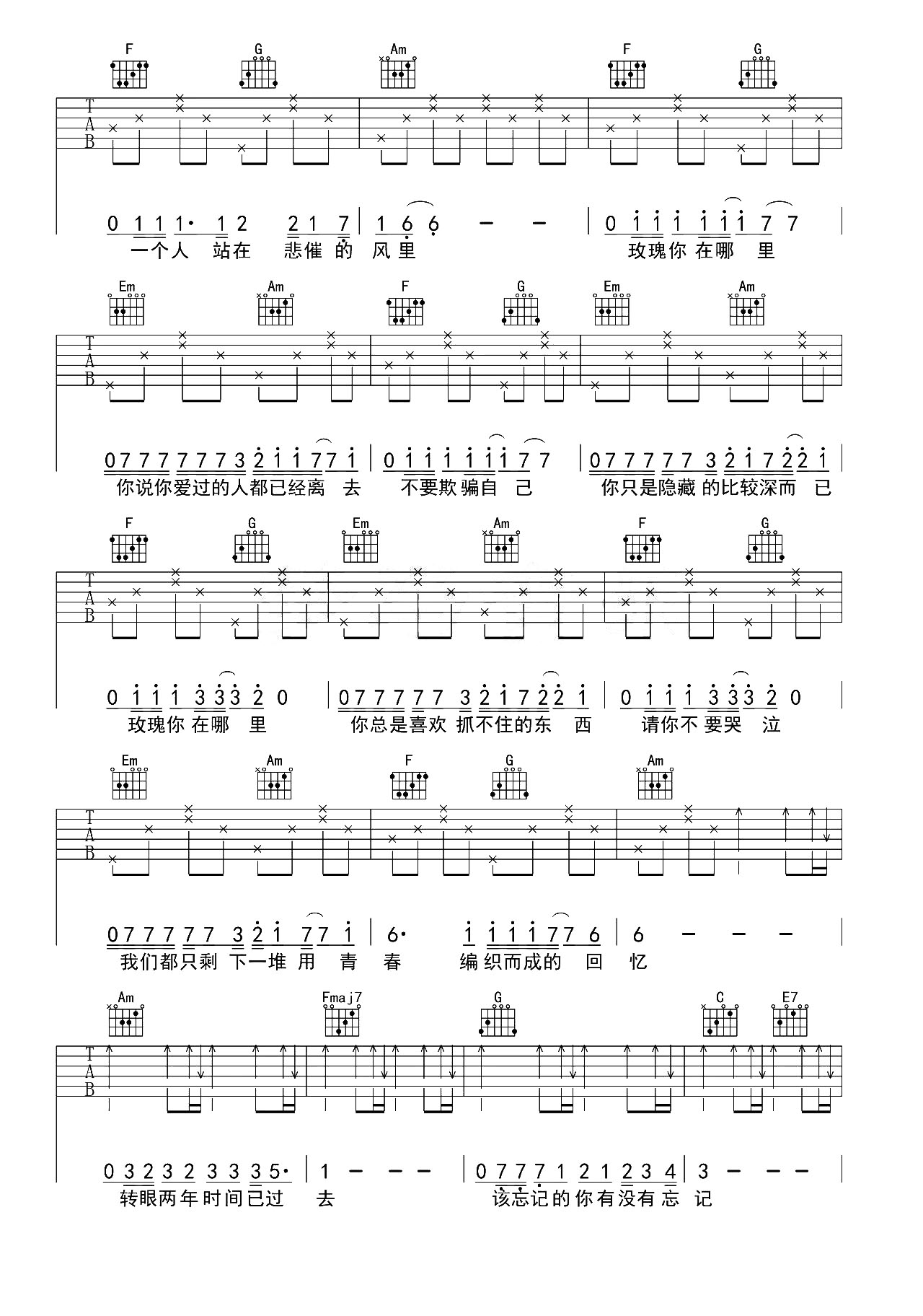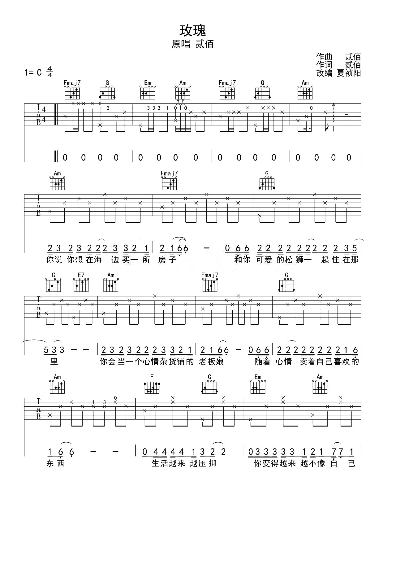 曲谱介绍: 贰佰《玫瑰》吉他弹唱谱,采用C调指法编配,共有4张高清图谱。