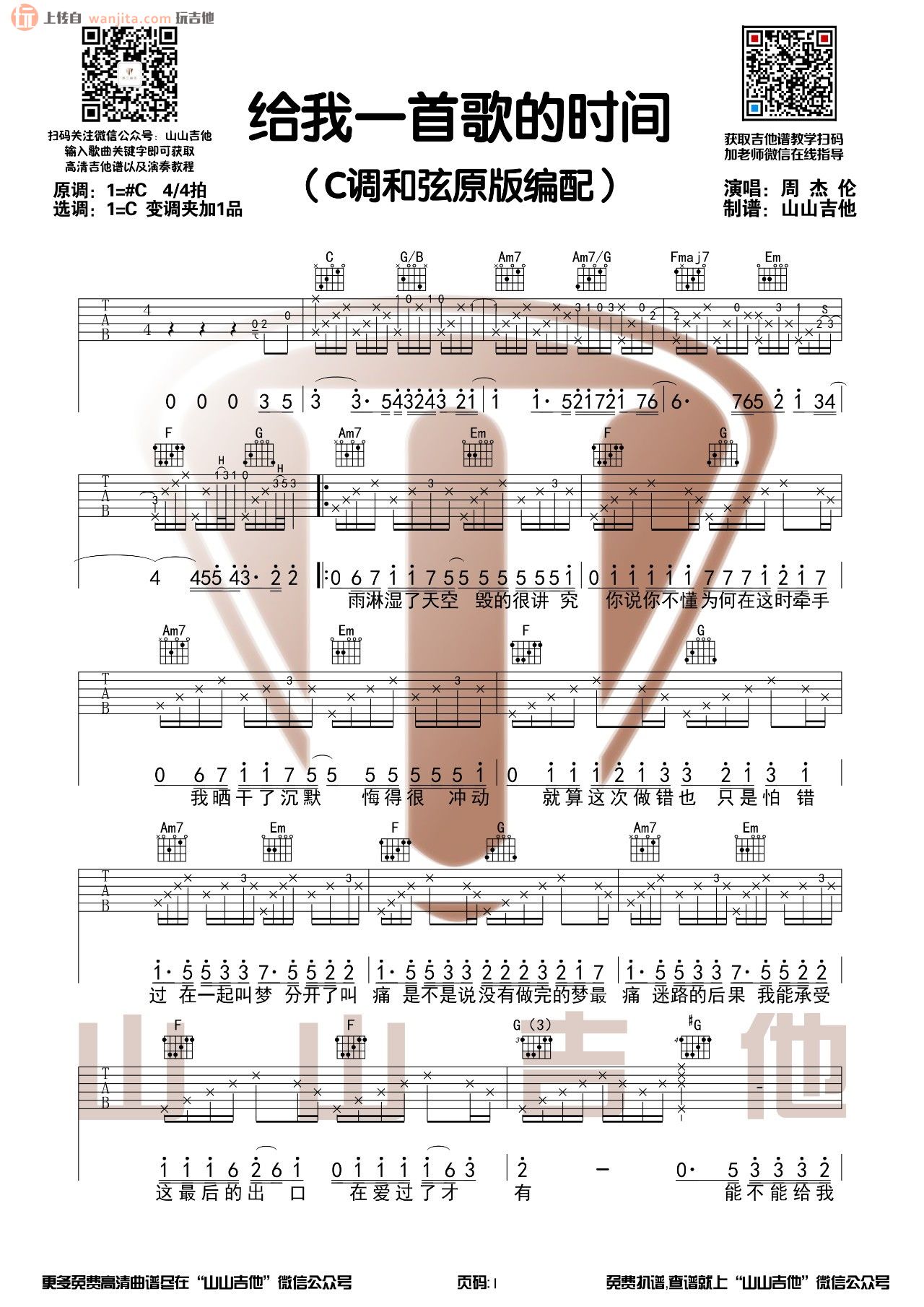 曲谱介绍: 给我一首歌的时间吉他谱原版是#C调4/4拍,曲谱选用的是C调编配,变调夹夹在第一品,是按照原版一样编配,不过相对来说有一些简化,由山山吉他分享。 《给我一首歌的时间》吉他弹唱演示示范视频