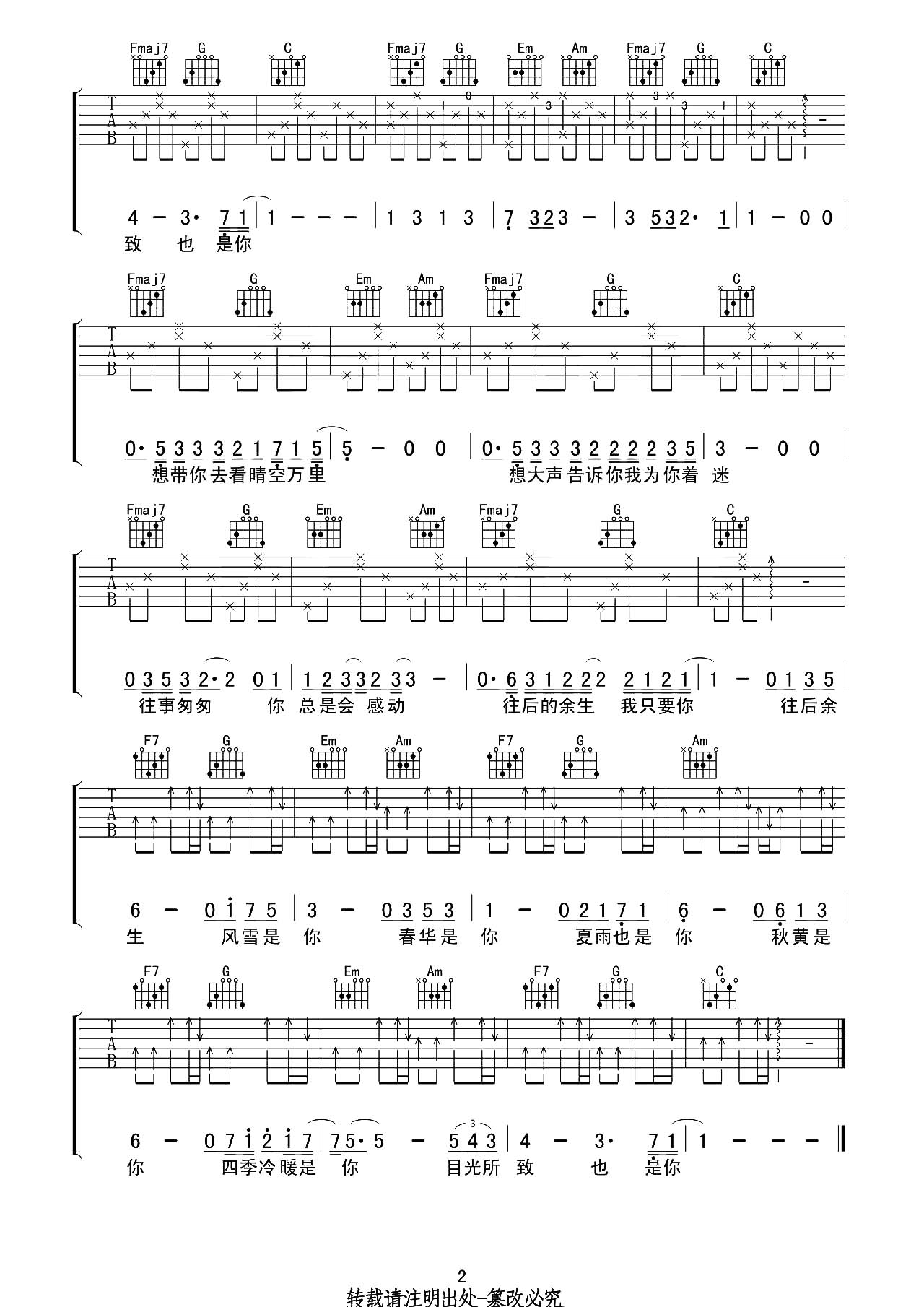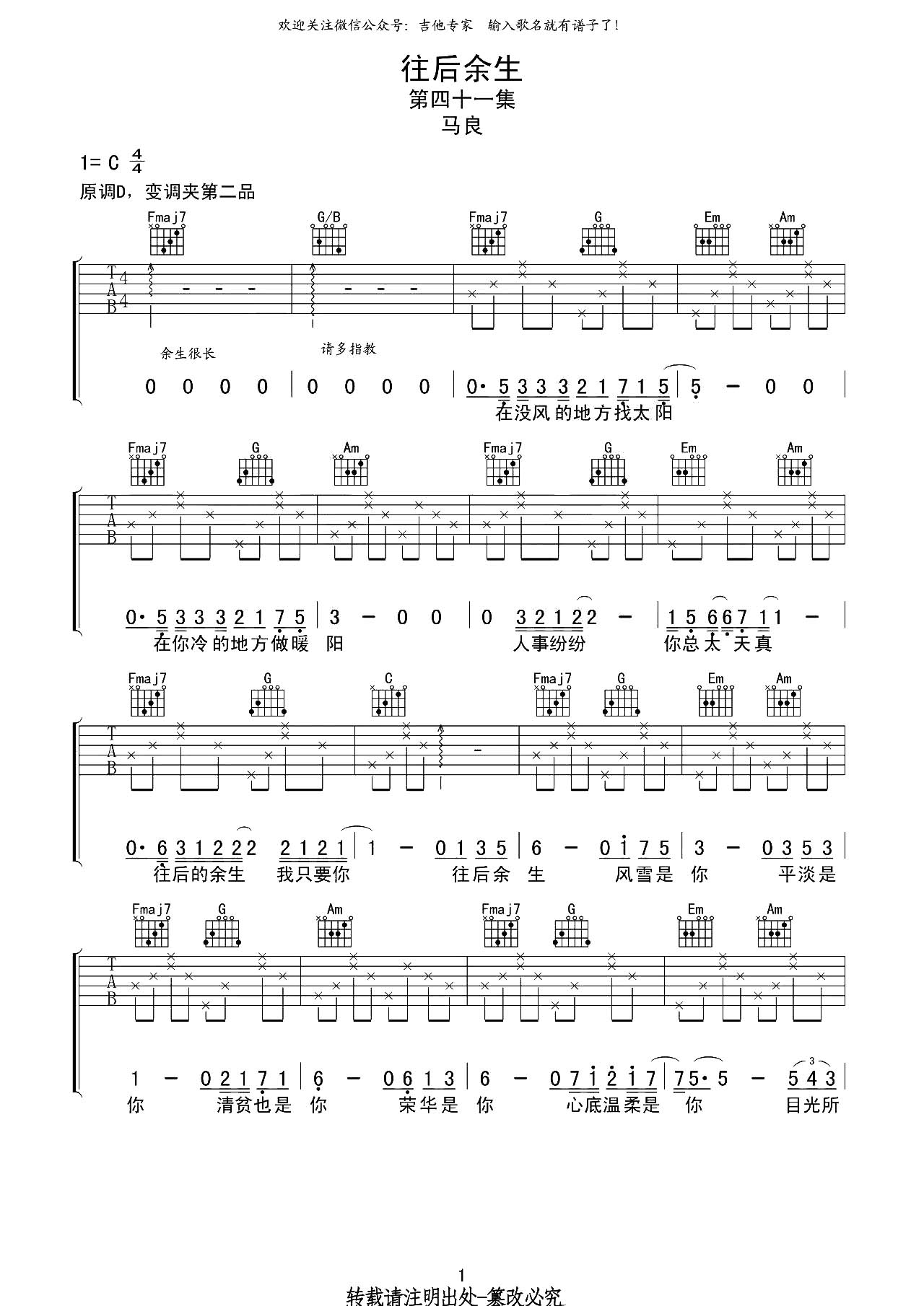 曲谱介绍: 马良《往后余生》吉他弹唱谱,采用C调指法编配,共有2张高清图谱,免翻页排版设计。