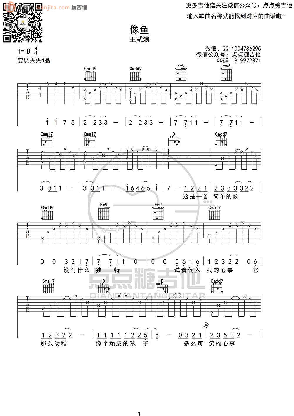 曲谱介绍: 像鱼吉他谱由点点糖吉他分享,原版是B调,这个版本选用G调编配,变调夹夹在第四品处,包含部分前奏主歌部分分解和弦弹唱,副歌是用扫弦来处理节奏,玩吉他提供整理编辑上传,喜欢的朋友不要错过这首网红歌曲,赶紧试试。