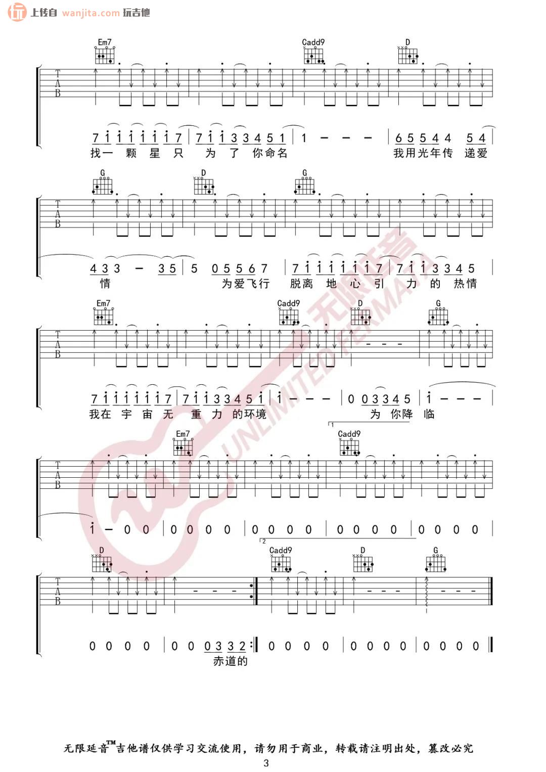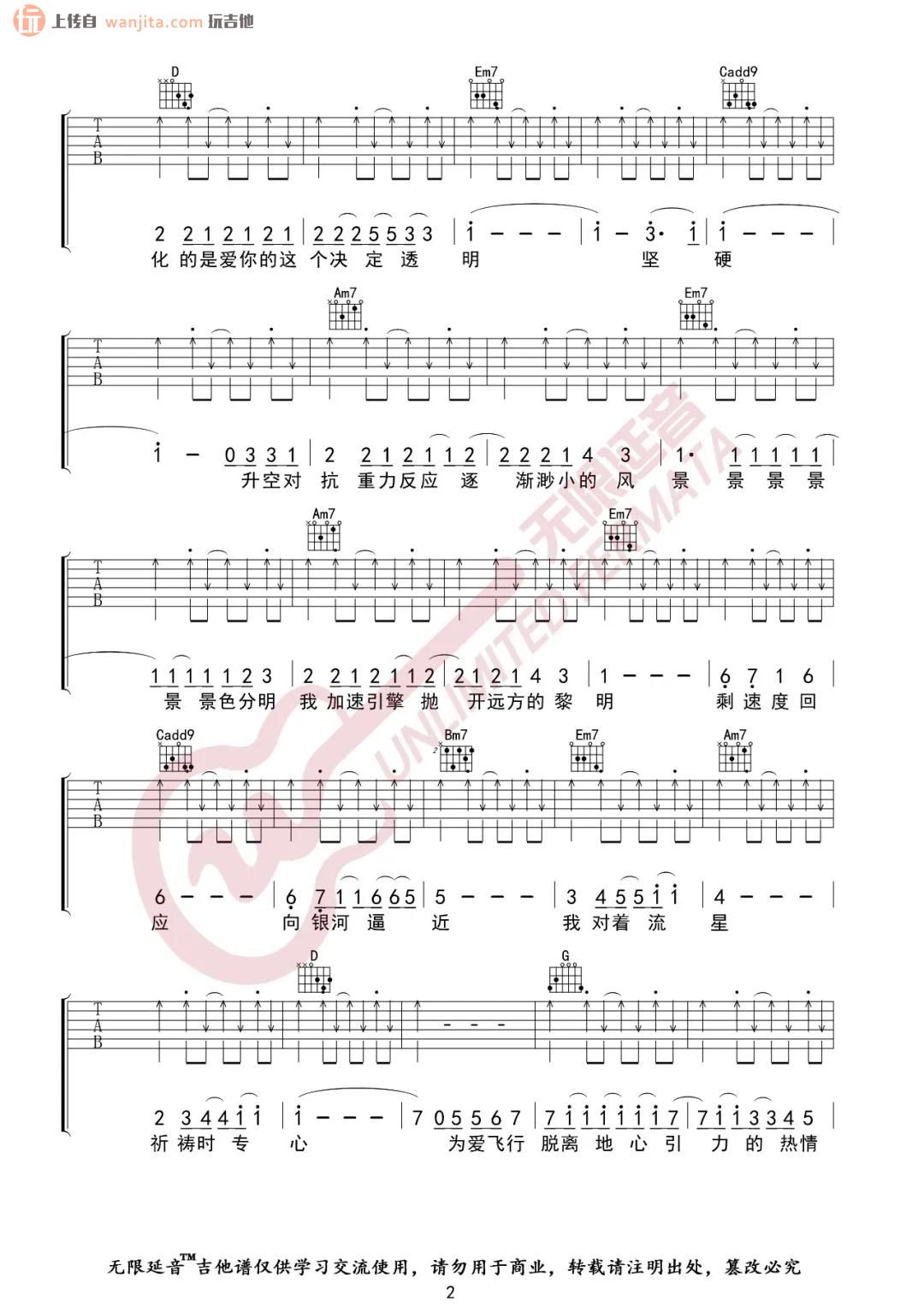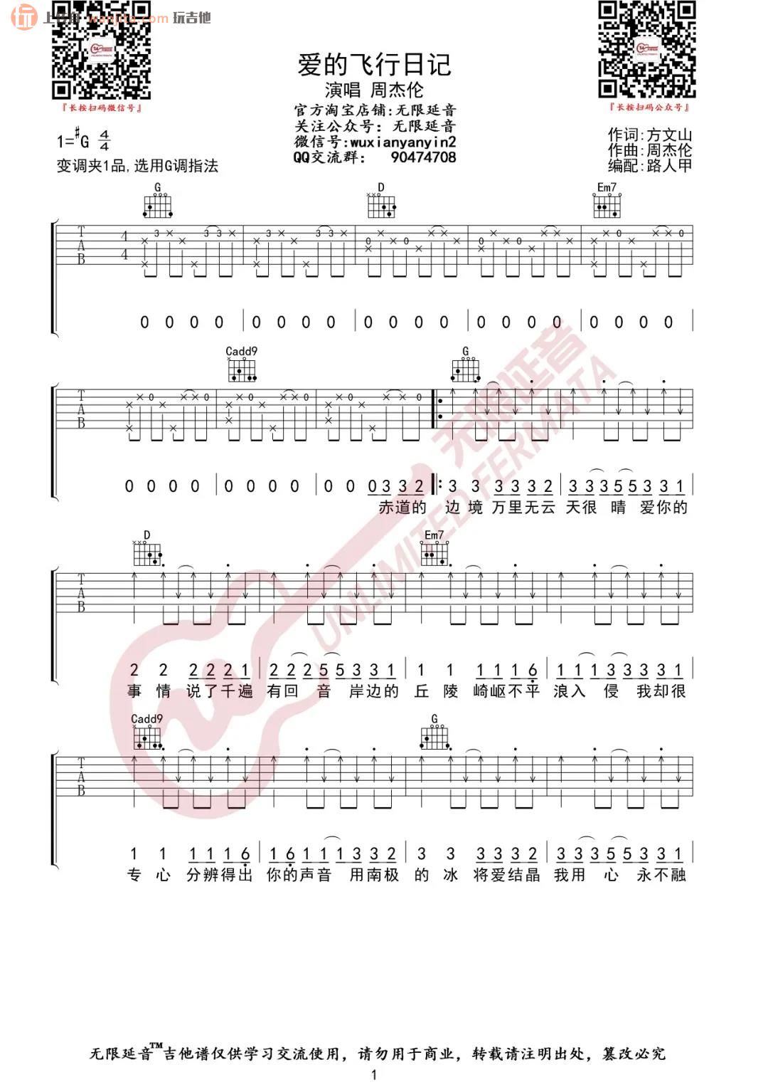 曲谱介绍: 爱的飞行日记吉他谱由无限延音分享,原调是#G调,本曲谱选用G调执法编配,如果需要按照原调弹唱,变调夹夹一品即可,这首歌包含了完整的前奏部分,其余主要以扫弦为主。