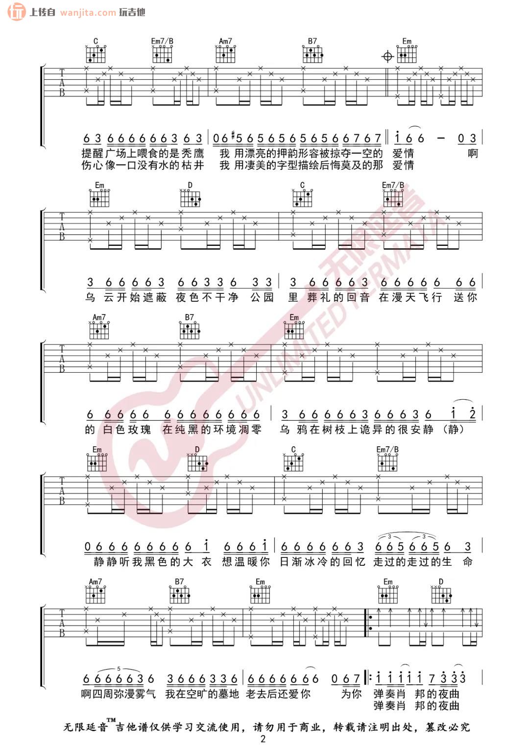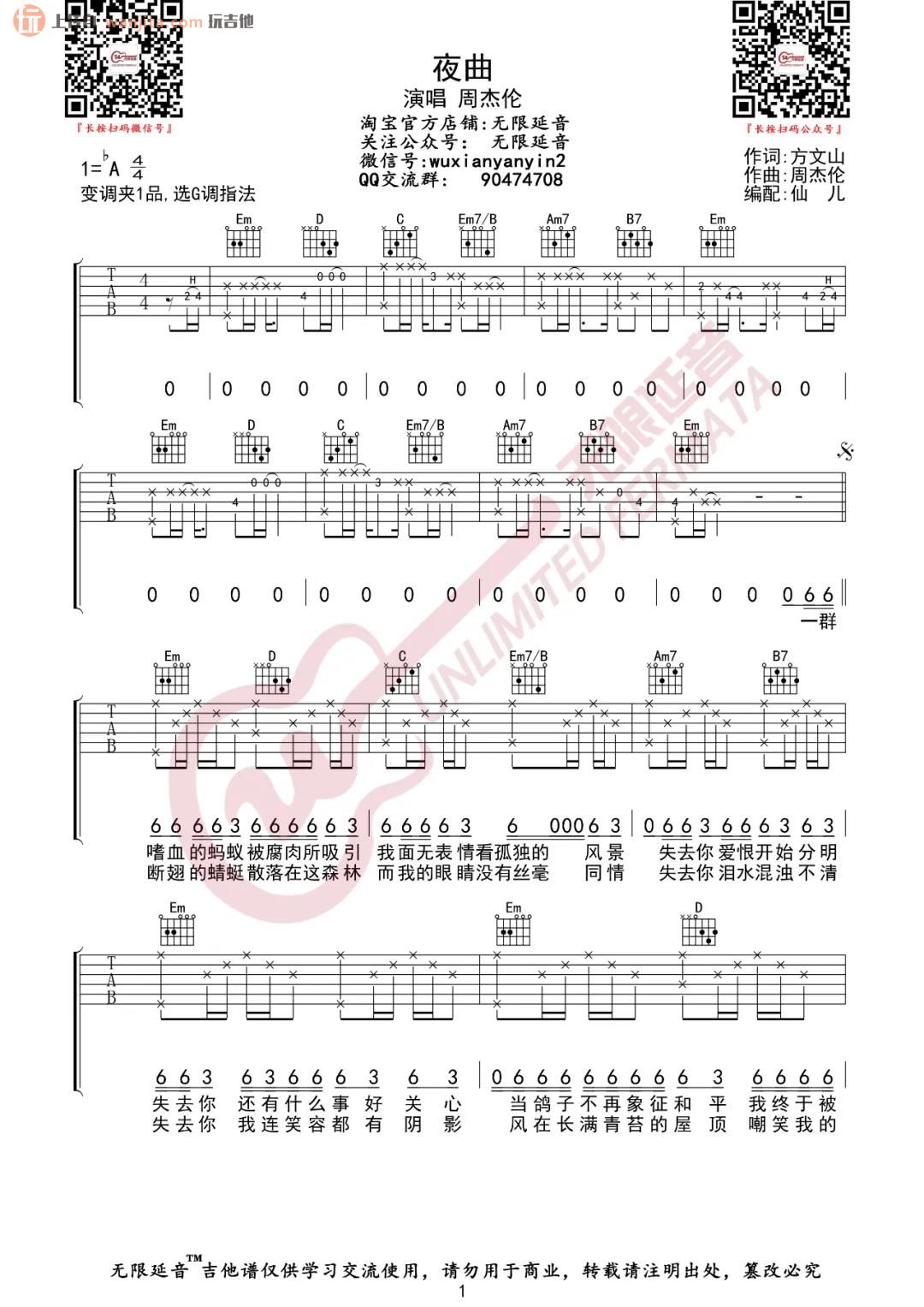 曲谱介绍: 《夜曲》吉他谱,原调是bA调,无限延音分享的G调指法编配版本,包含了完整的前奏,主歌部分的分解和弦配合副歌的扫弦,成了这首歌的节奏组合,和弦部分的难度并不大,其实掌握好弹奏和演唱节奏,应该是很好的弹唱这首歌,喜欢的朋友赶紧试试吧。