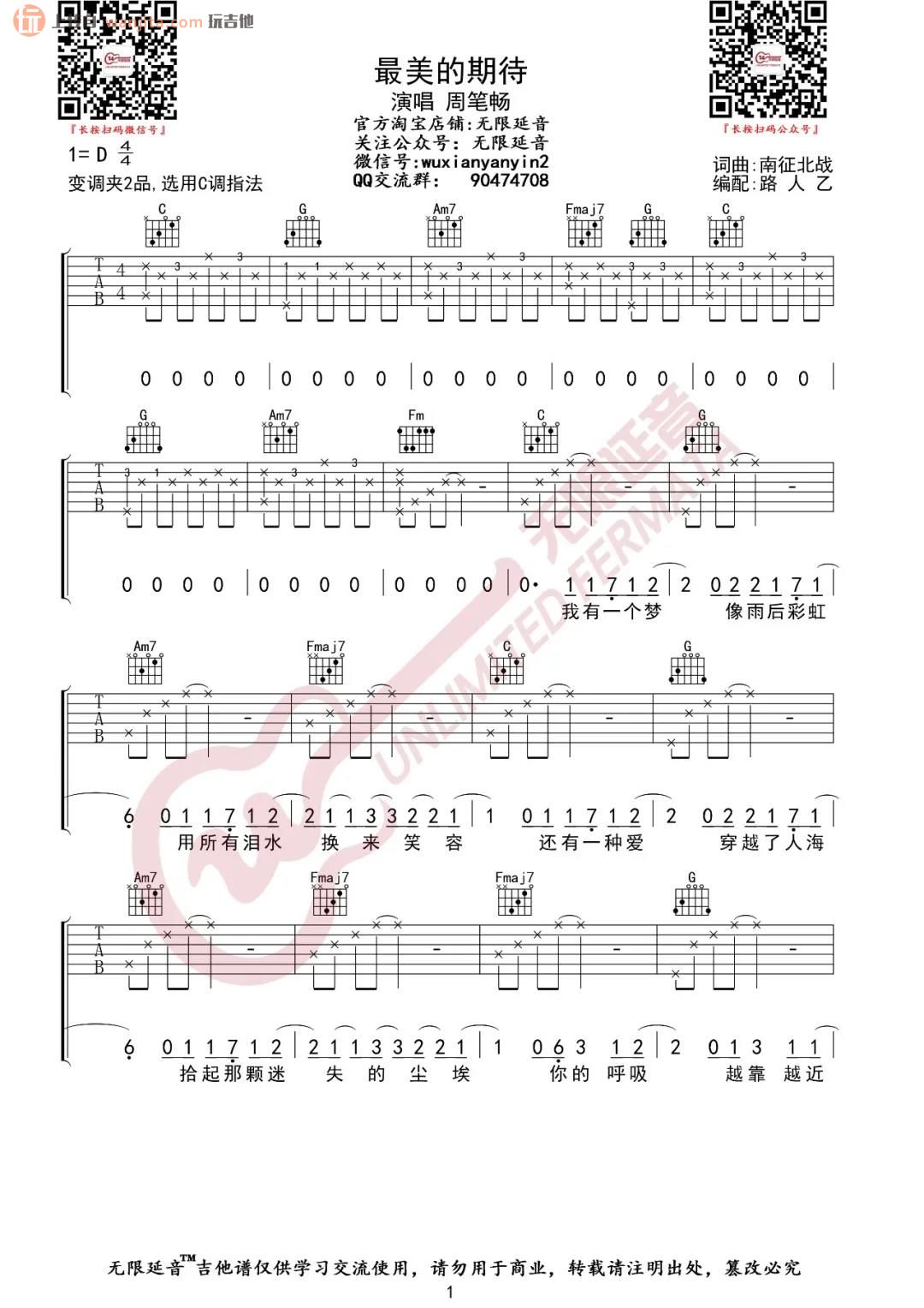 曲谱介绍: 由无限延音分享的《最美的期待》吉他谱,原调是D调,选用C调指法编配,歌曲包含了前奏部分,难度不是特别的大,主歌和副歌部分基本上有基础的同学可以很快速的上后。