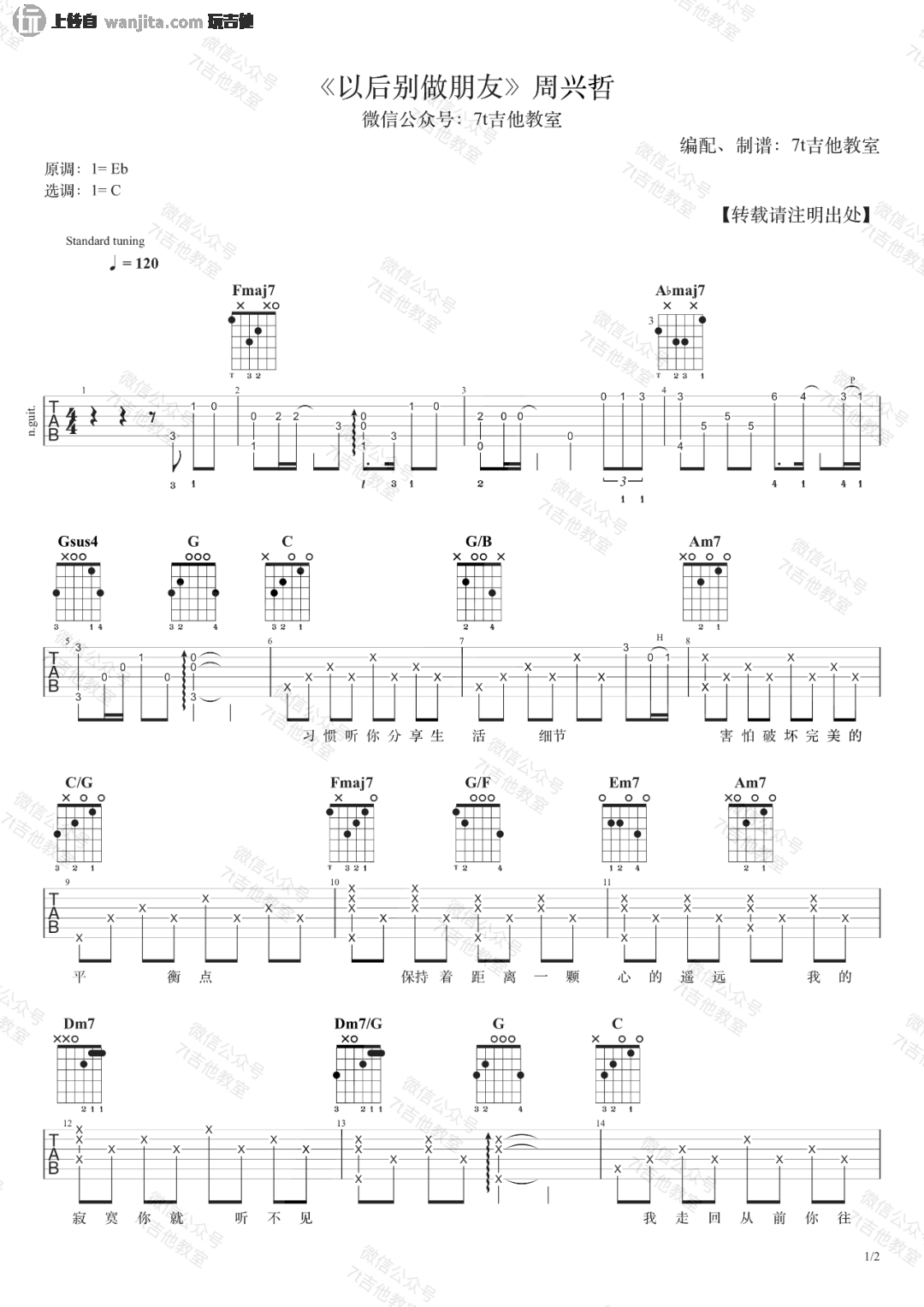 曲谱介绍: 由7T吉他教室分享的《以后别做朋友》吉他谱,这首歌是周兴哲自己作曲,原调是Eb大调,而曲谱选用的C调指法来编配,下方有演示视频,建议朋友可以先参考收听一下,示范的视频中是降半音调弦,没有使用变调夹,音域比较低的朋友可以选择这样弹唱。想唱原调的小伙伴用标准音调弦,变调夹夹第3品就可以了 《以后别做朋友》吉他弹唱演示示范视频