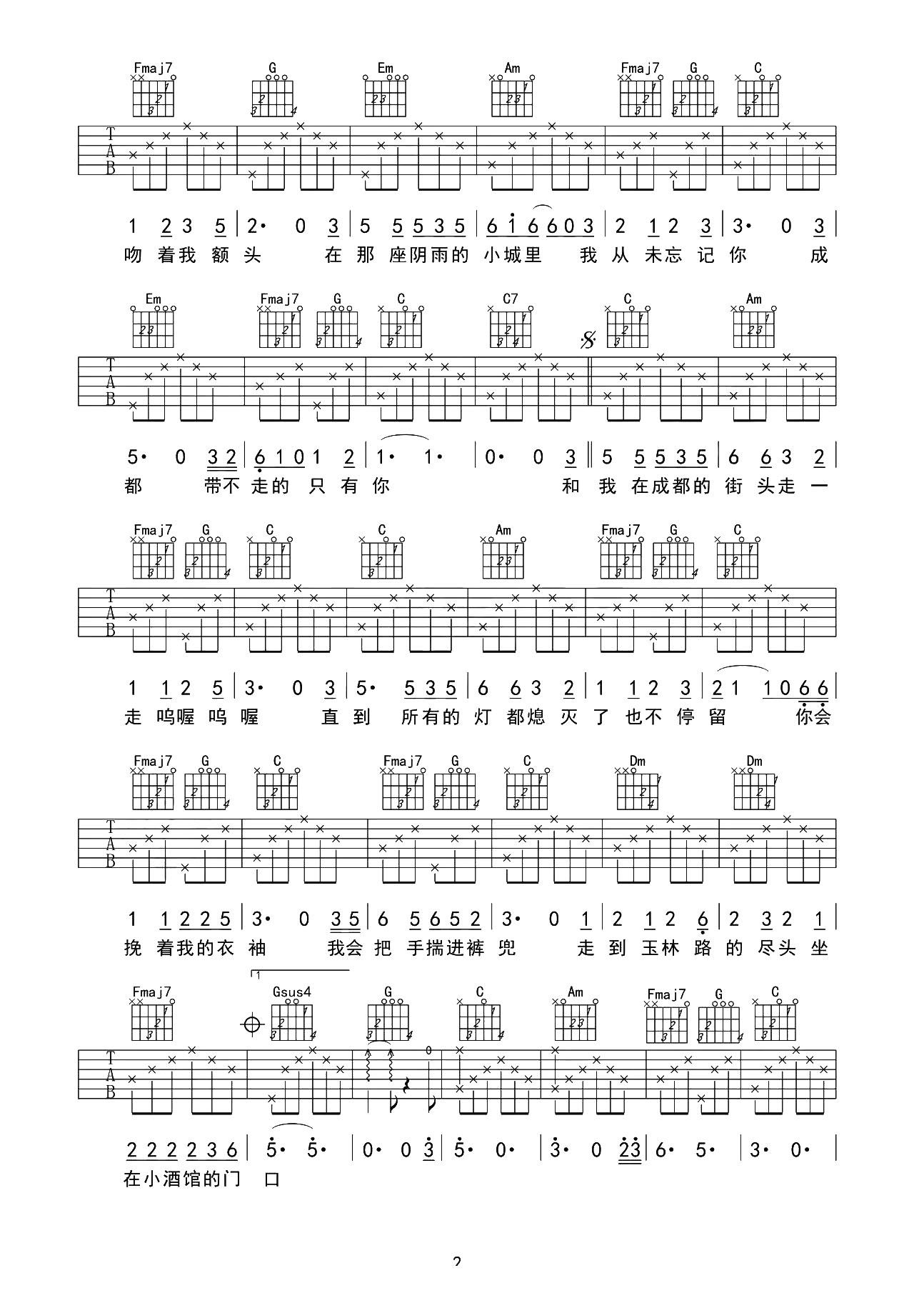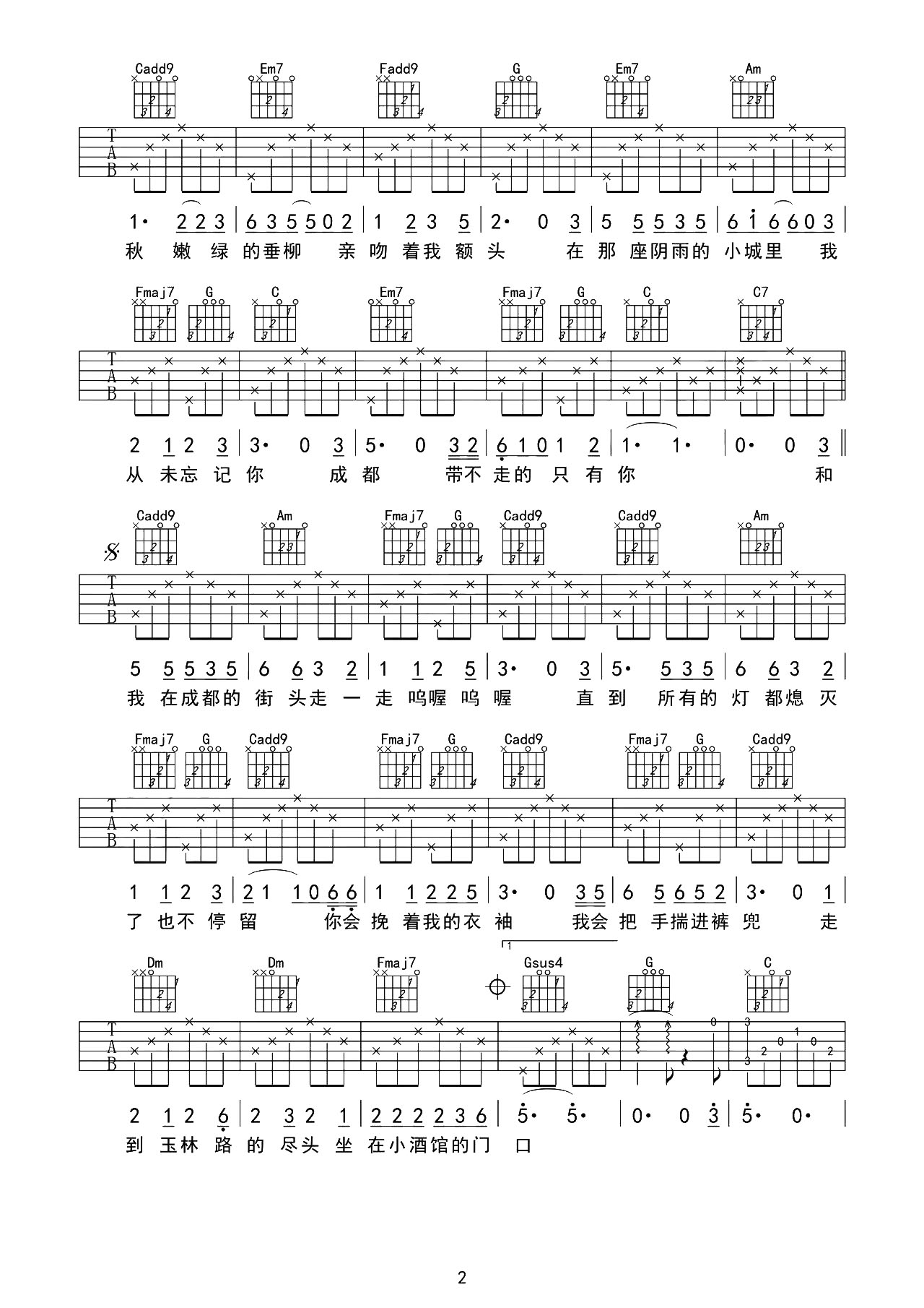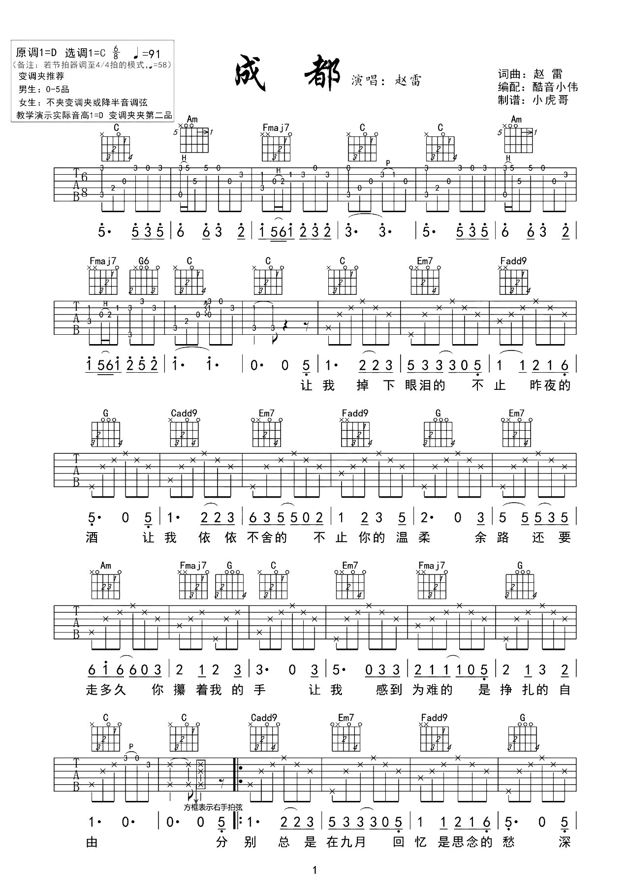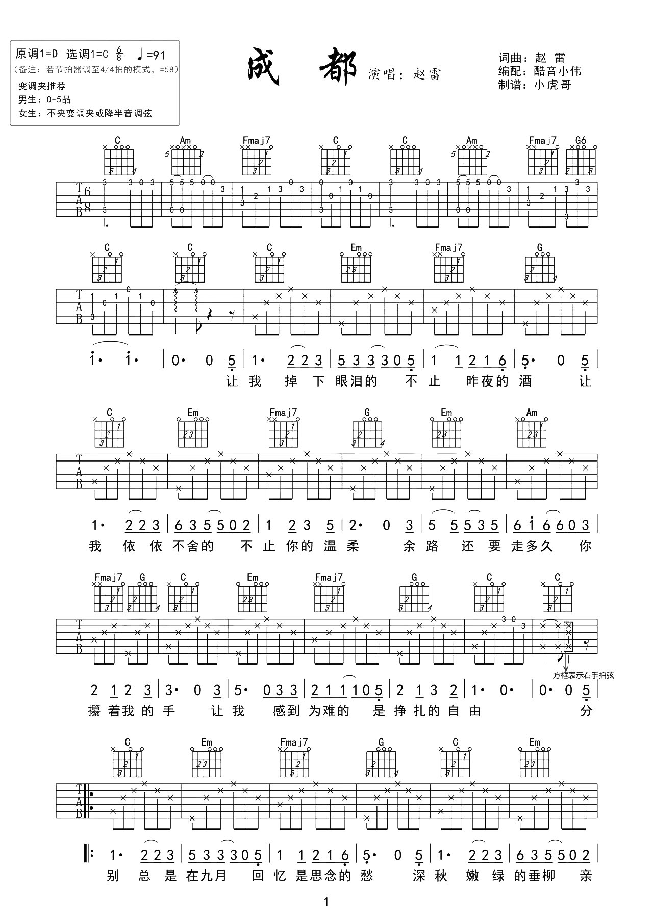 曲谱介绍: 来自酷音小伟分享的《成都》吉他谱,原调是D调,吉他谱分两个版本,C调中级版/初级版,第一个版本为中级版【附《成都》弹唱演示+教学视频】,按原版编配打造,左手和弦难点部分在前奏和间奏,主歌和副歌部分还是比较好弹唱上手。节奏6/8拍,节拍器可以按91拍每分钟来处理;按4/4的节奏来弹的话,节拍器每分钟可以58拍处理。大家可以根据自己的情况选择适合自己的版本。 《成都》初级版教学视频 《成都》中级版演示+教学视频 《成都》吉他谱C调中级版