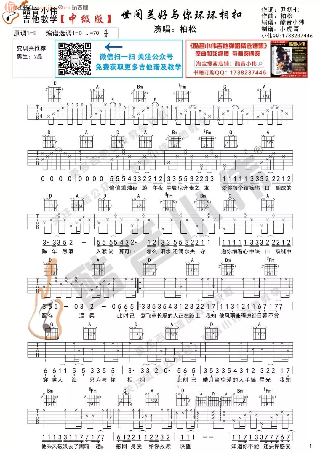 曲谱介绍: 《世间美好与你环环相扣》吉他谱,由酷音小伟分享,总共提供了两个版本,D调中级版/C调初级版,原调是E调,中级版本选用D调指法,初级版本则是用的C调指法编配,下方视频是演示的D调中级版的弹唱,喜欢的朋友可以先参考一下下方吉他弹唱教学视频,另外基础稍微差点觉得中级版有所难度,可以考虑练习初级版本,在难度上稍微进行了一些简化。 《世间美好与你环环相扣》D调中级版吉他弹唱教学视频 《世间美好与你环环相扣》吉他谱D调中级版