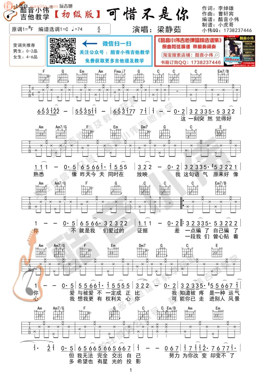 曲谱介绍: 《可惜不是你》吉他谱,由酷音小伟分享,原调#F,选用C调执法编配,这个谱子为初级版,新手比较好上手。《可惜不是你》本是梁静茹的原唱,而曹轩宾演唱过的版本也格外的深情,下方吉他弹唱视频为男版演唱,虽然和曹轩宾的版本节拍上有些区别,但是不影响,所以建议以曹轩宾的版本来弹唱,当然也可以弹唱梁静茹的版本,女生如果要弹唱,变调夹根据自己的音域来调整。 《可惜不是你》吉他弹唱教学视频