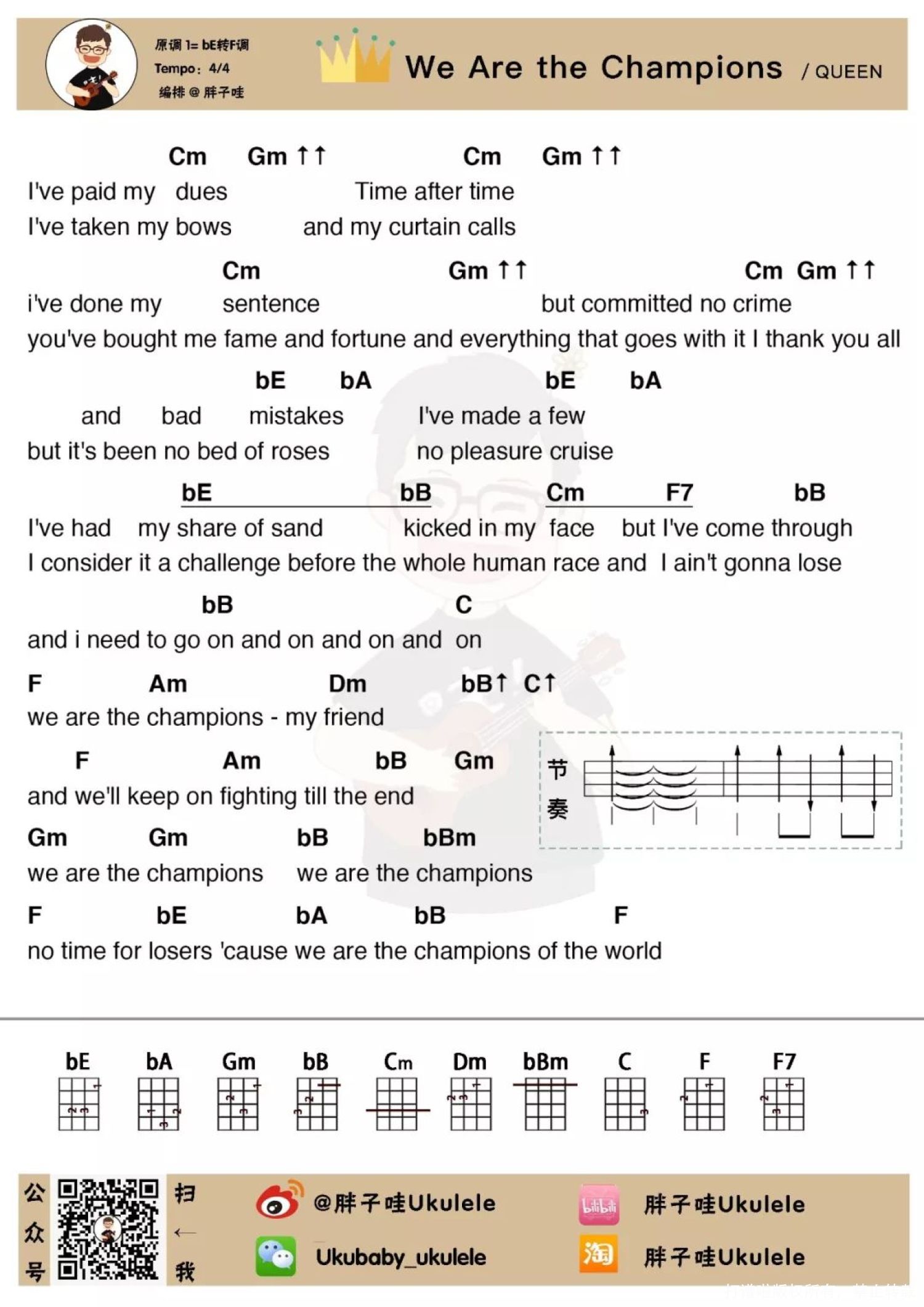 曲谱介绍: We Are the Champions / Ukulele Cover We Are the Champions | 弹唱谱 目录 《We are the champions》是Queen(皇后乐队)最著名的单曲之一,发行于1978年初,由乐队主唱Freddie Mercury 作曲。 歌曲以昂扬向上、震撼人心见长。现在常用于各种体育赛事以弘扬体育精神。而且曾在世界国际歌霸被誉为“最佳摇滚乐”激励奖。   We Are the Champions / Ukulele Cover   弹唱Cover 指弹Cover 今晚将会为谁响起这首歌,我们拭目以待!   We Are the Champions | 弹唱谱