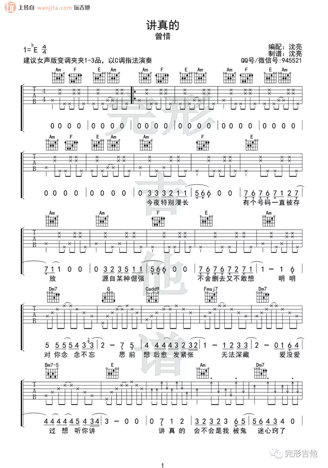 曲谱介绍: 讲真的吉他谱由完形吉他沈亮老师提供分享,总共提供了两个版本的曲谱,一个是男版G调,另一个是女版C调,演示视频也是根据男版来演示,这首歌曲,男版的原调是bE调,作为单乐器伴奏,这首歌曲最重要的节奏就是击弦和切音的出现,会是这首歌曲的关键之处,女生版同样需要注意关键点,就不多赘述,整首歌曲都会变得活力起来,喜欢的朋友需要多多练习,大家可以参考下方的吉他弹唱视频演示。 《讲真的》吉他弹唱教学视频示范